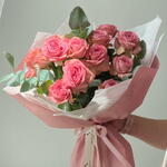 A refined bouquet of two shades of roses with eucalyptus — a perfect blend of tenderness and elegance. A refined bouquet in two shades of roses with eucalyptus — a perfect combination of delicacy and elegance.