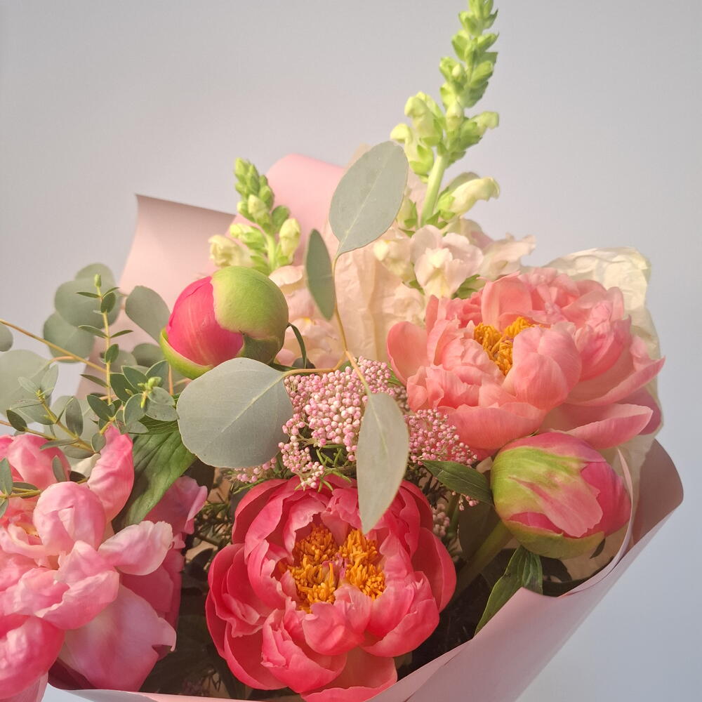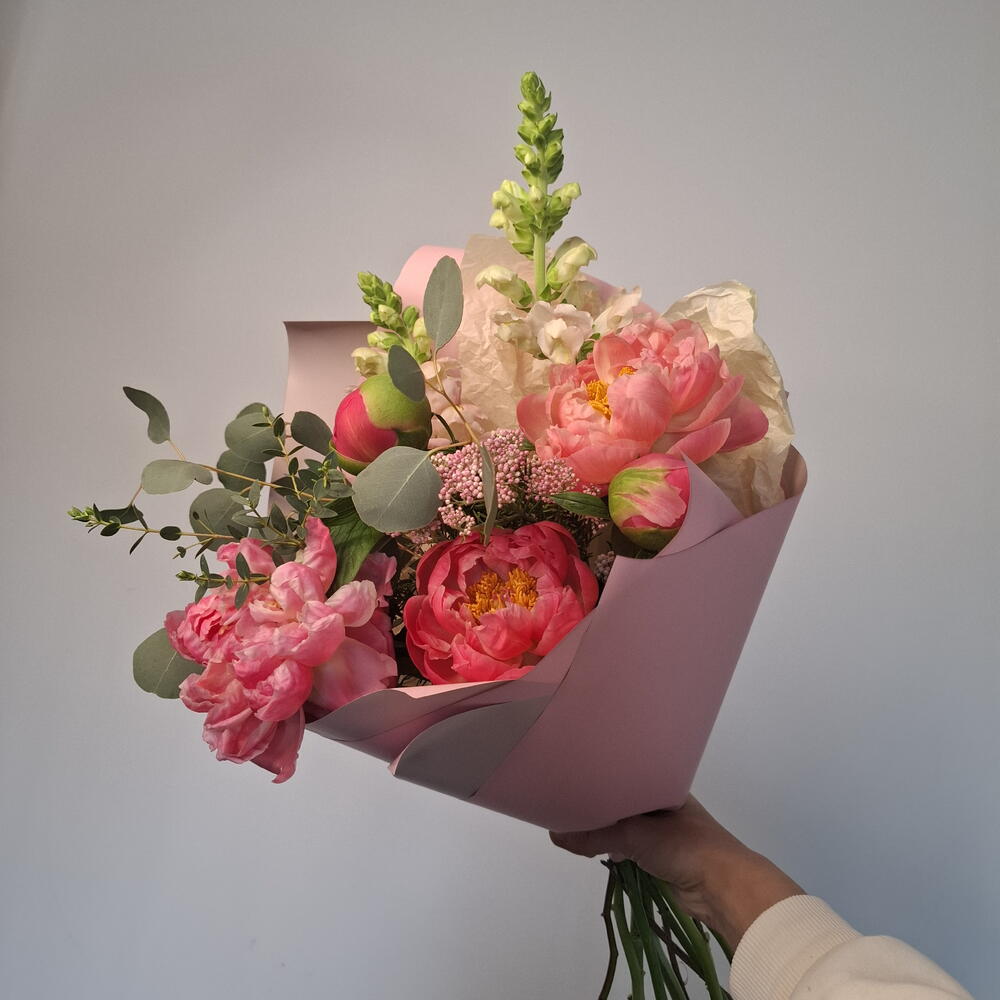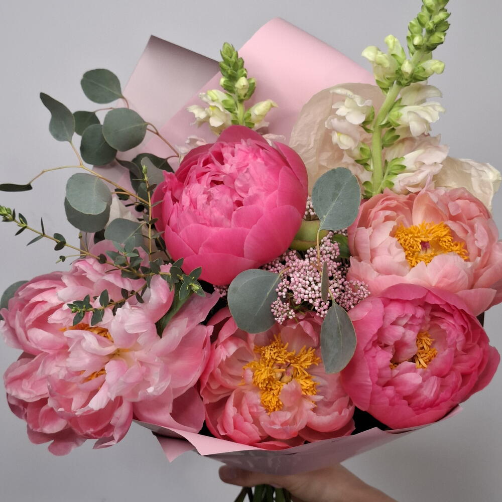 peonies - 5 pcs eucalyptus leaves - 3 pcs antirrhium - 2 pcs