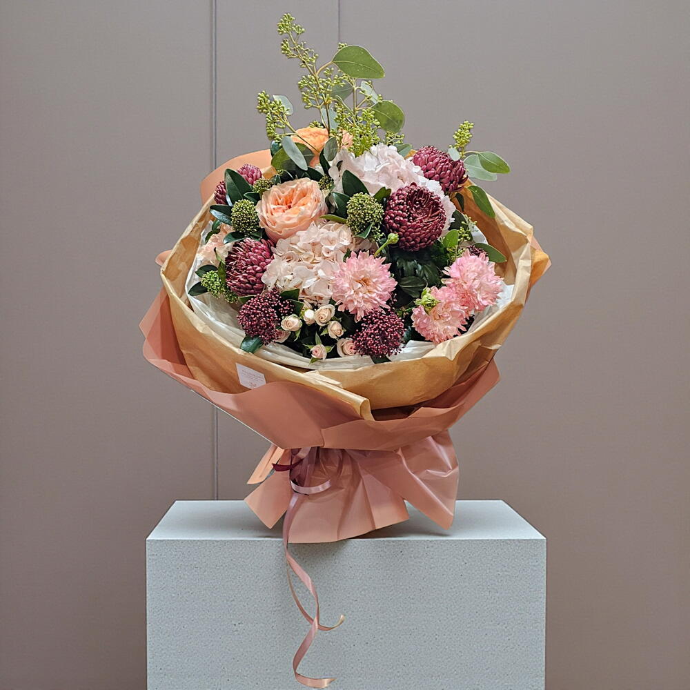 chrysanthemums - 4 pcs roses - 4 pcs spray roses - 5 pcs various greenery and ads - 5 pcs