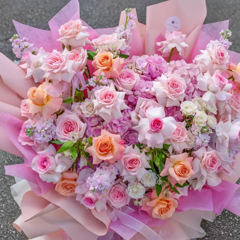 matthiola - 6 pcs pink hydrangea - 2 pcs peach roses - 10 pcs pink spray roses - 10 pcs blush pink roses - 18 pcs