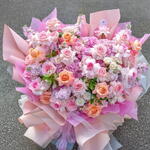 Indulge in the exquisite world of blooms with this breathtaking arrangement from our Florists Specials. A frothy fusion of elegance and sweetness, this bouquet features six matthiola stems, two stems of pink hydrangea, ten stems each of peach and pink spray roses, and a generous mix of eighteen blush pink roses. With their vibrant pop of color and intoxicating fragrance, these flowers bring an effortless sophistication and charm to any space. Impeccably arranged and ready to awe, this lush selection is perfect for lifes every moment.