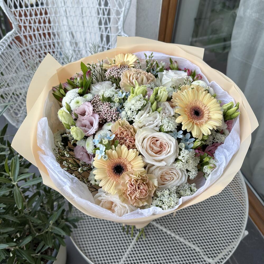 Limonium - 3 pcs Gerbera - 5 pcs Lisianthus - 5 pcs santini - 5 pcs carnation - 5 pcs oxypetalum - 3 pcs roses - 5 pcs