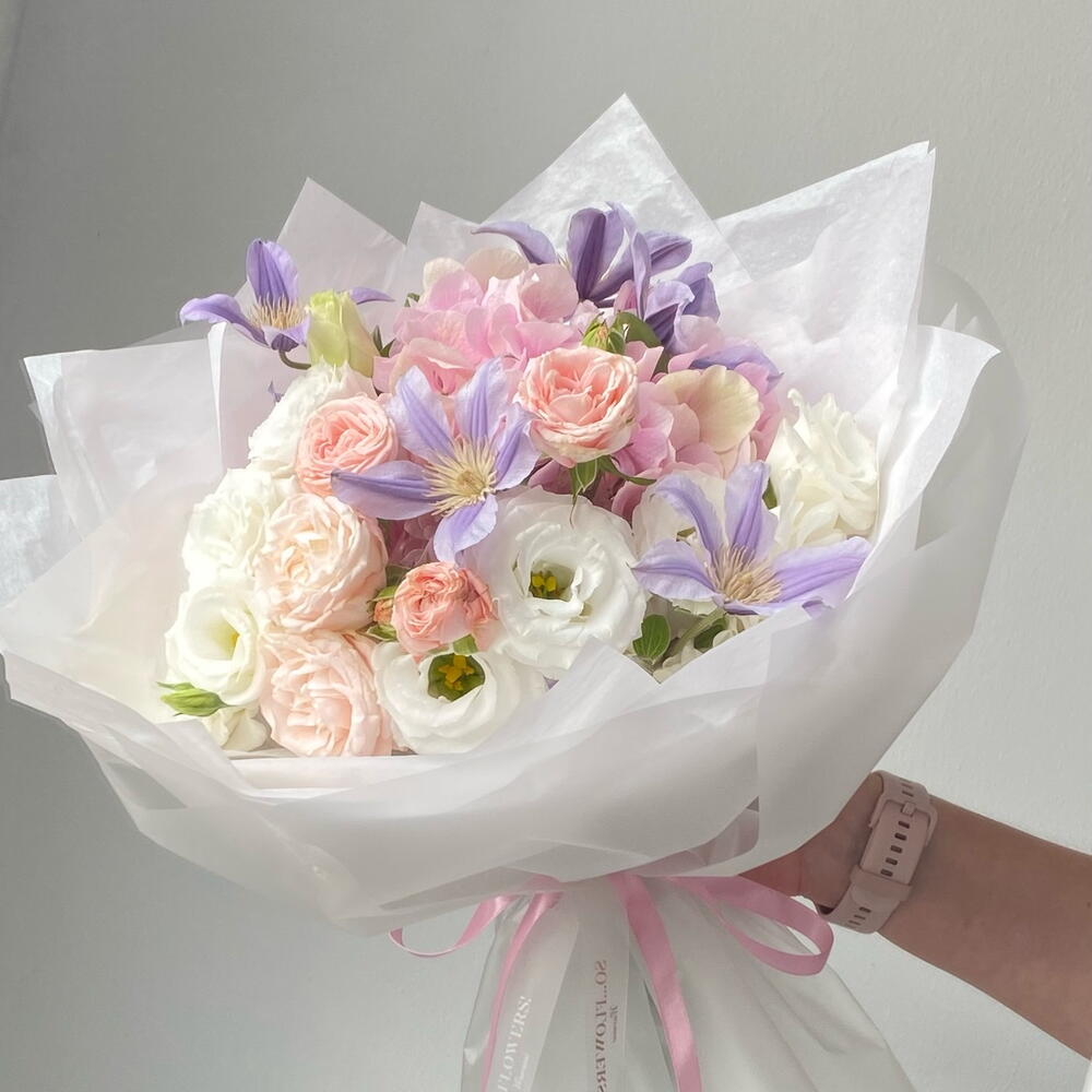 Eustoma - 2 pcs Spray rose - 2 pcs Hydrangea - 1 pcs Clematis - 2 pcs