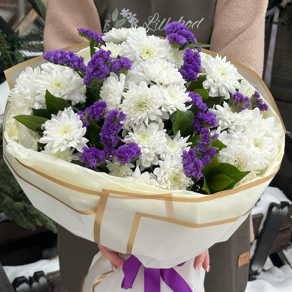 White chrysanthemums paired with delicate limonium create a fresh and balanced bouquet that stays beautiful for a long time.