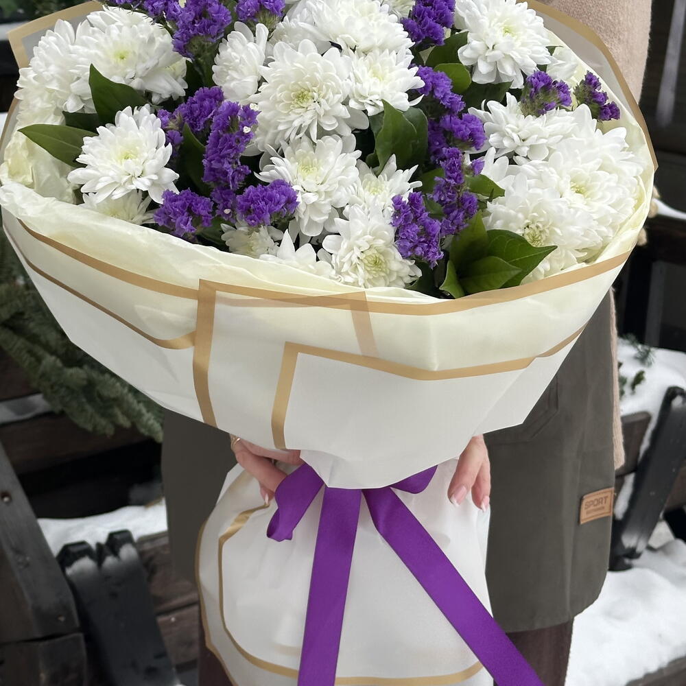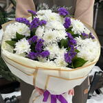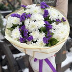 Satin ribbon - 1 pcs Chrysanthemum - 7 pcs designer wrapping - 5 pcs limonium purple - 5 pcs