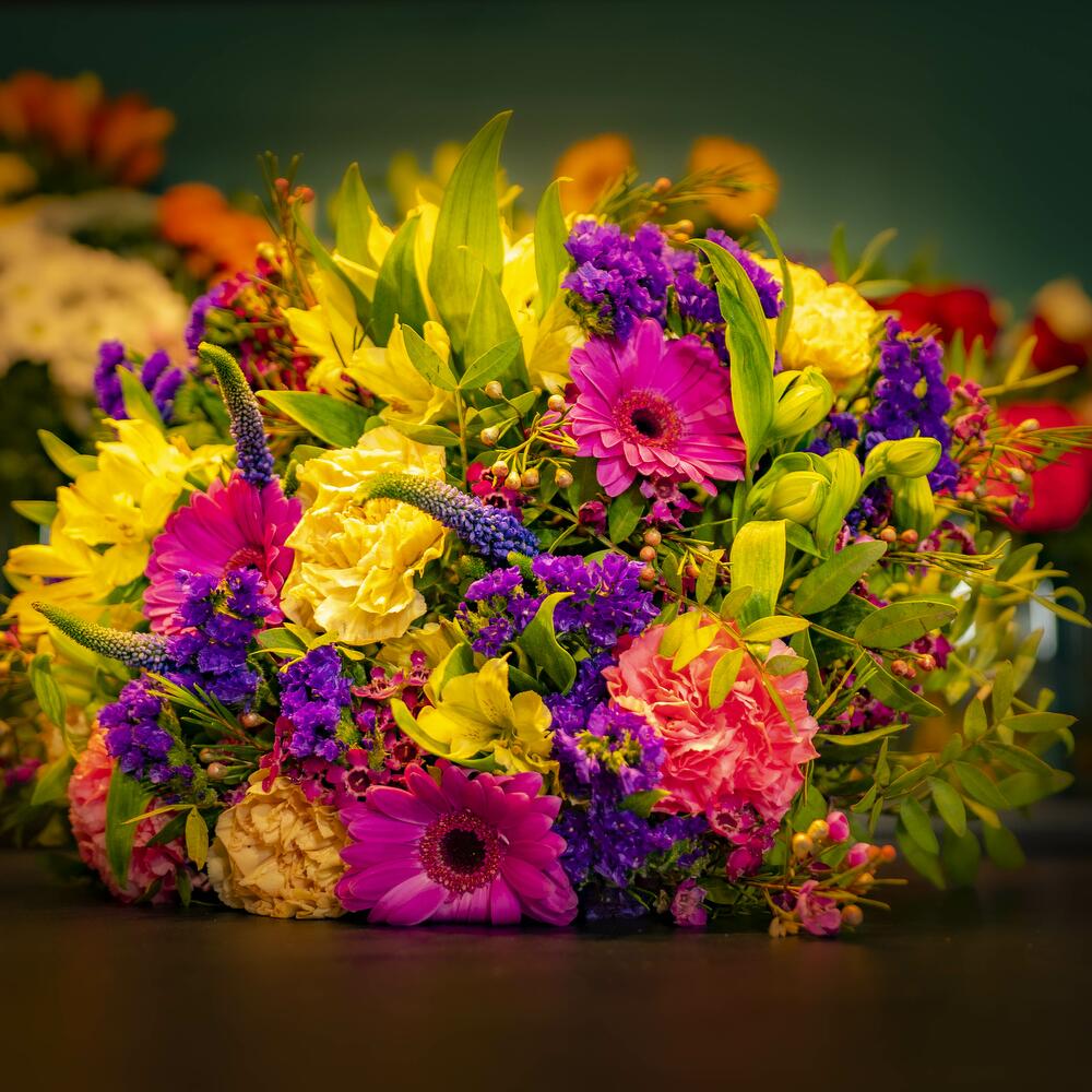 Veronica - 3 pcs Limonium - 3 pcs Gerbera - 7 pcs Wax flower - 3 pcs carnation - 11 pcs alstremeria - 7 pcs