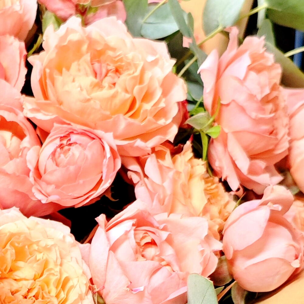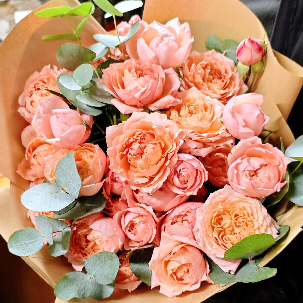 A breathtakingly romantic bouquet featuring 9 lush apricot-toned Juliet peony spray roses — one of the most coveted garden rose varieties, admired for their full, ruffled blooms and delicate warmth — gracefully complemented by soft silvery-green eucalyptus. Wrapped in natural kraft paper and tied with a matching apricot satin ribbon for an effortlessly elegant finish.