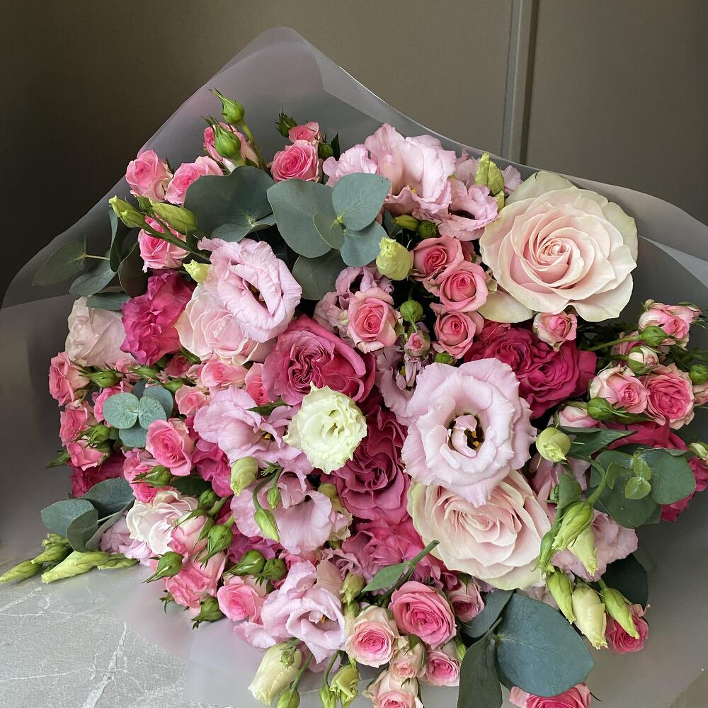 Eustoma - 10 pcs eucalyptus - 5 pcs kobarroos - 10 pcs roses - 15 pcs