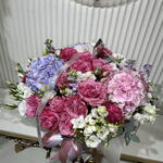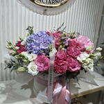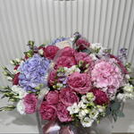 Eustoma - 20 pcs mattiola - 8 pcs eucalyptus - 6 pcs hydrangeas - 4 pcs roses - 25 pcs freesia - 15 pcs