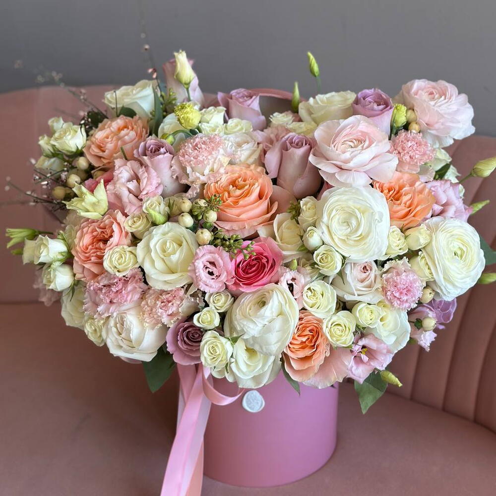 Box - 1 pcs Lisianthus - 2 pcs ranunculus - 3 pcs fillers - 3 pcs roses - 10 pcs spray roses - 3 pcs