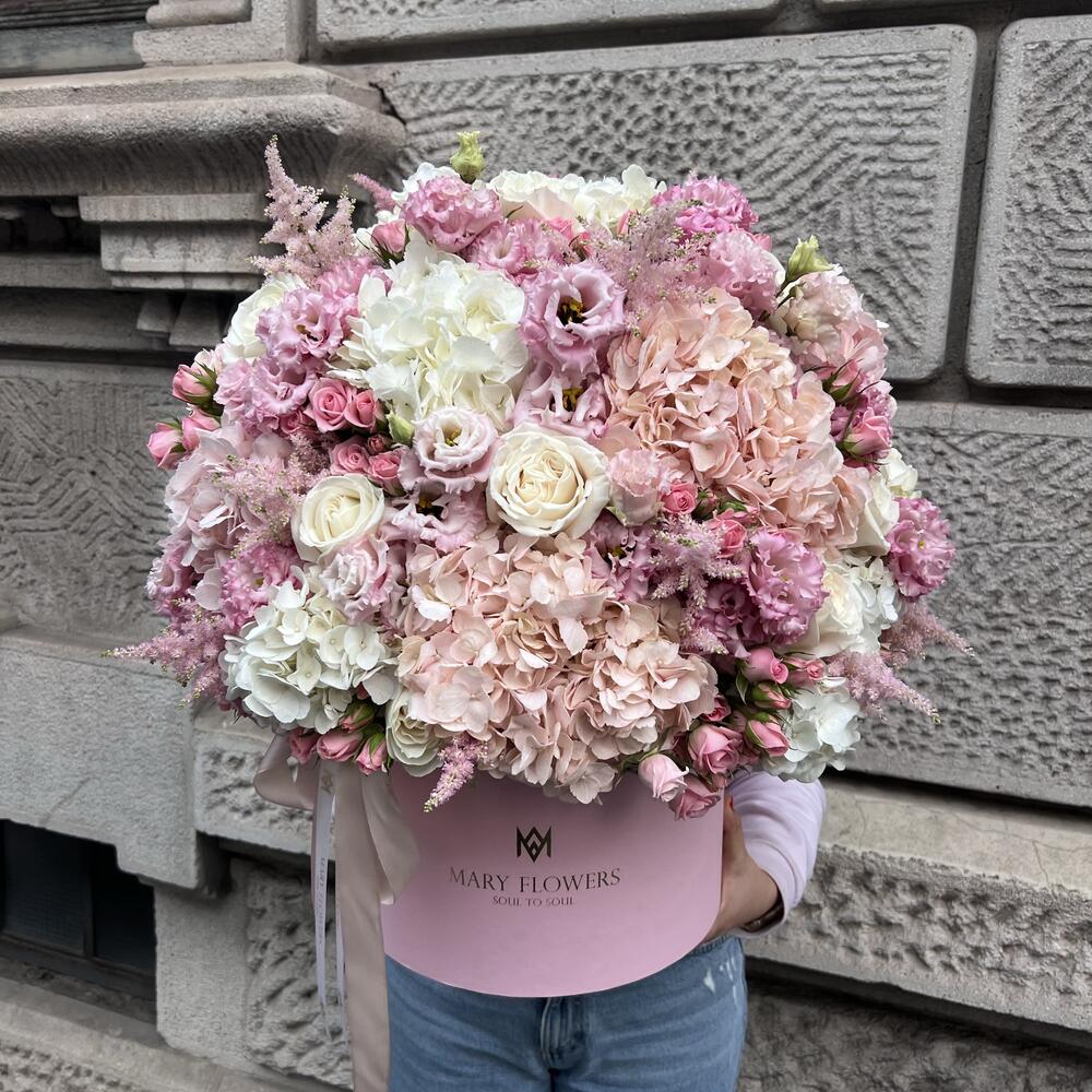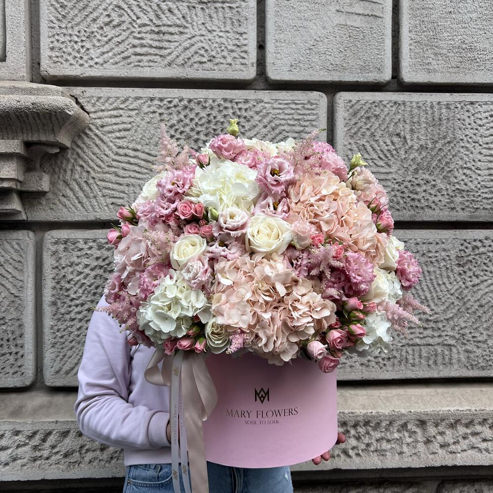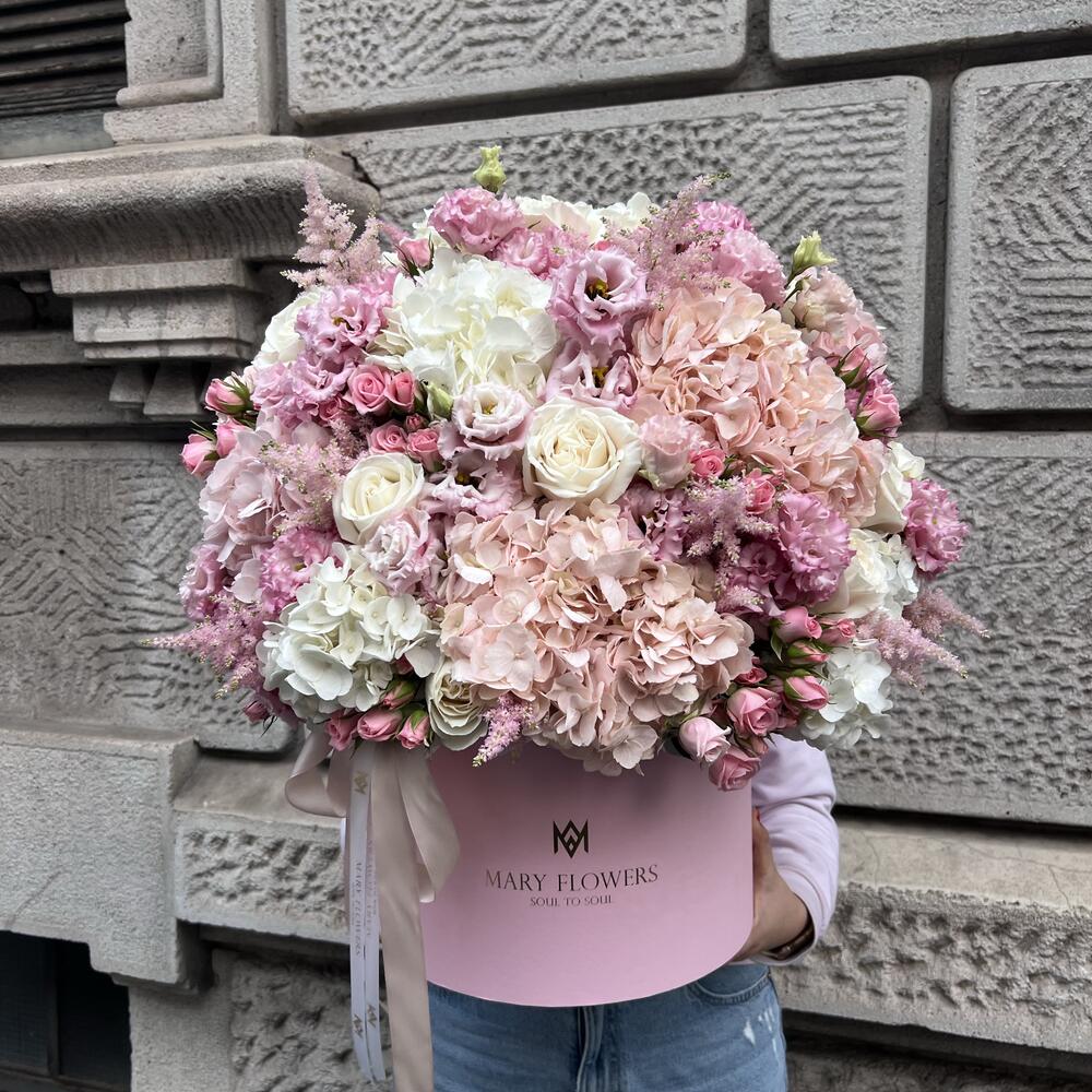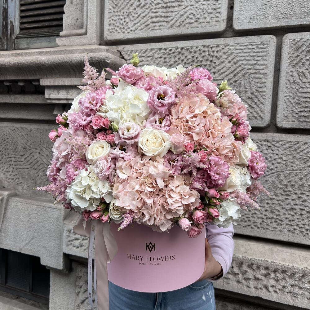Lisianthus - 15 pcs rose playa blanka - 15 pcs ortensie - 17 pcs rose ramificate - 11 pcs scatola - 1 pcs nastro - 2 pcs