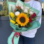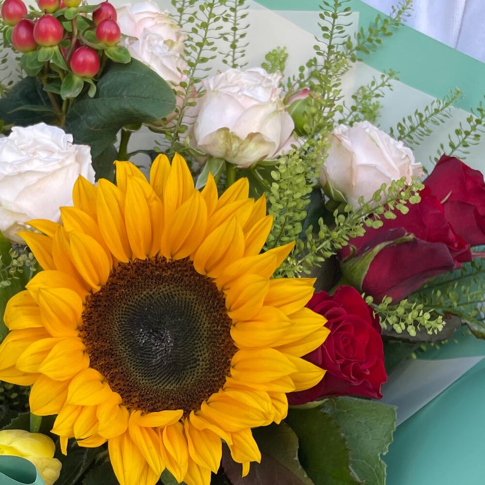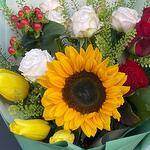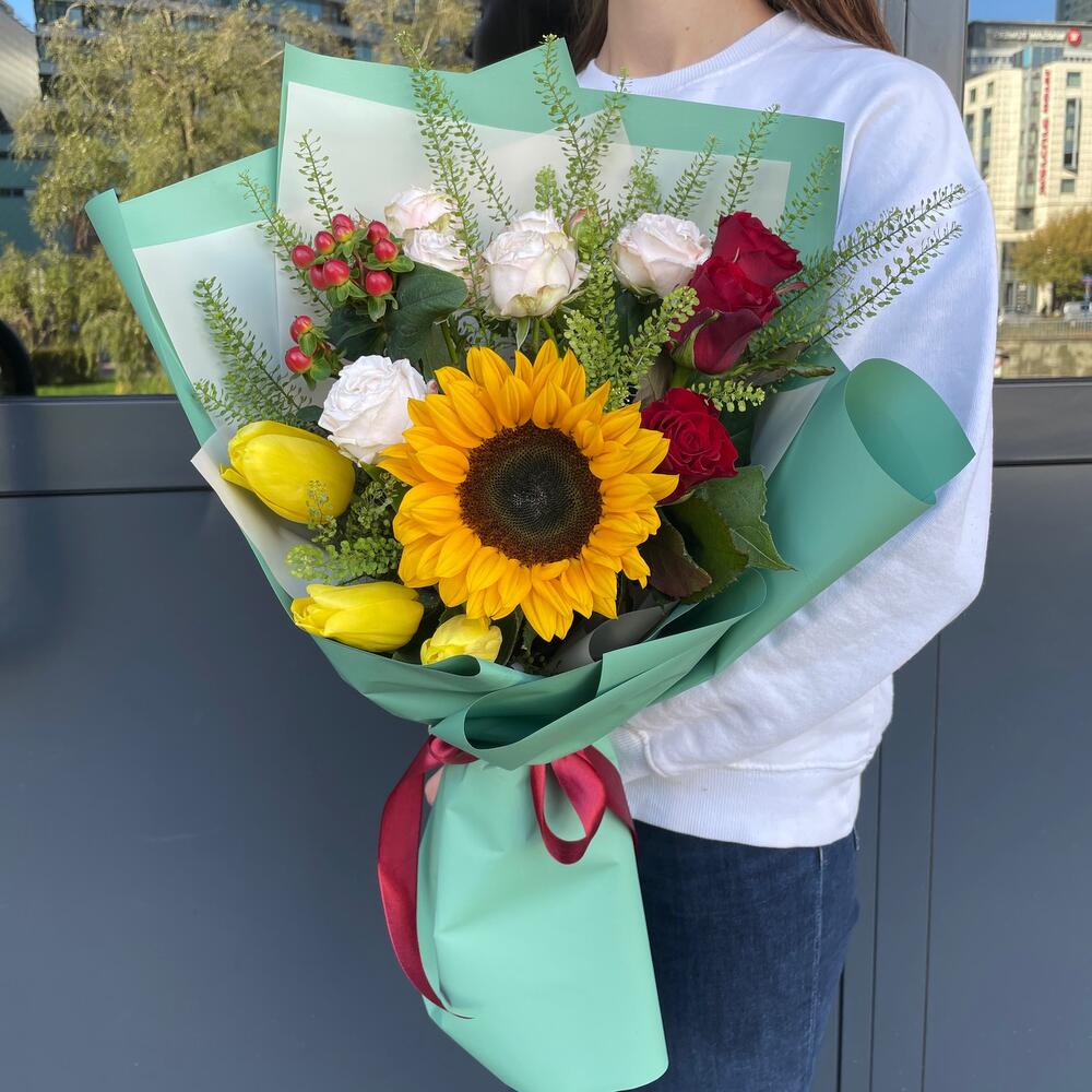 Rose - 3 pcs Tulip - 3 pcs hypericum - 1 pcs green - 2 pcs sunflower - 1 pcs spray rose - 1 pcs floral packaging - 3 pcs
