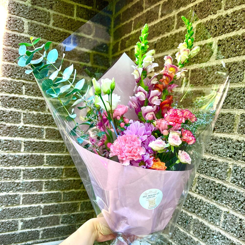 Ribbon - 1 pcs Eucalyptus - 2 pcs Snapdragon - 2 pcs Limonium - 2 pcs chrysanthemums - 2 pcs hypericum - 2 pcs spray carnations - 1 pcs lisianthus white - 1 pcs cryzal (powder for prolonging the life of cut flowers) - 1 pcs carnations pink - 3 pcs cellowrap - 1 pcs spray roses - 2 pcs craft paper pink - 1 pcs