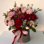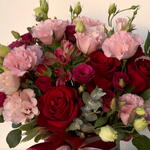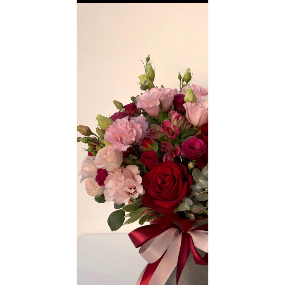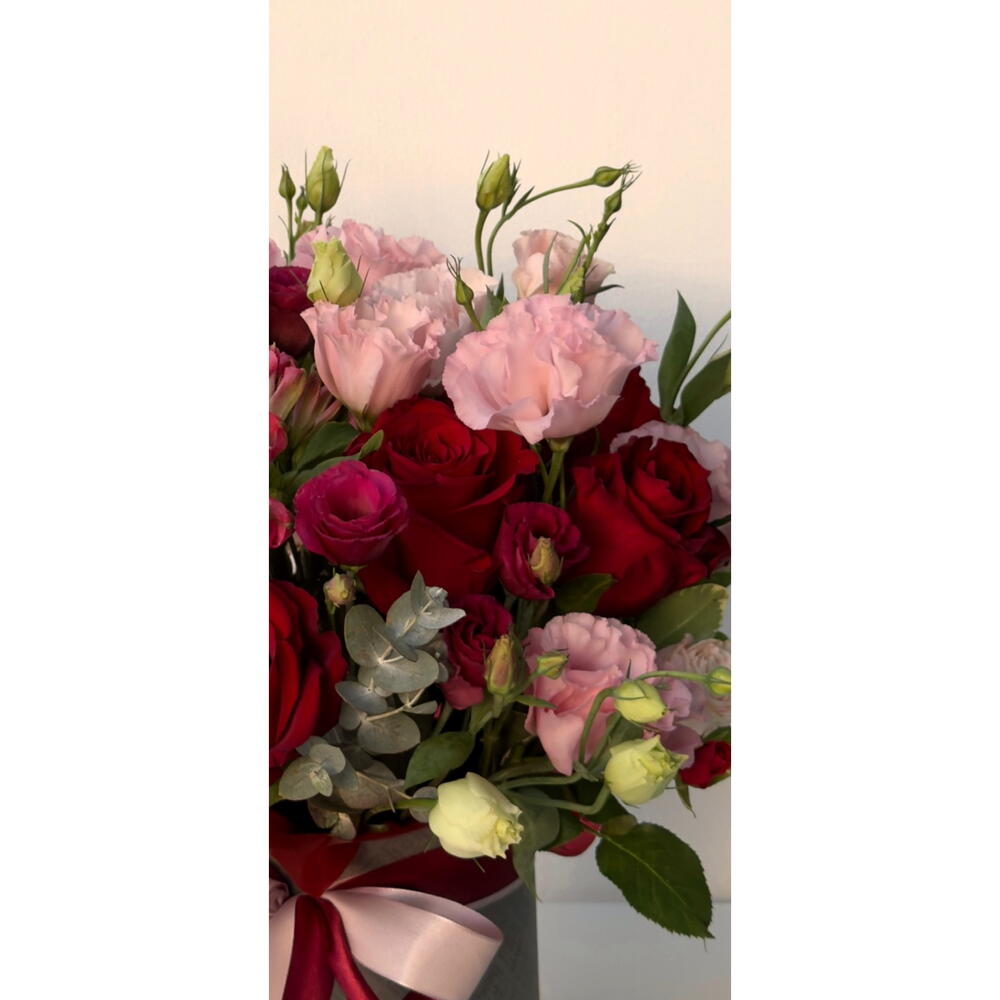 Eucalyptus - 2 pcs Alstroemeria - 2 pcs Lisianthus - 7 pcs seasonal flowers - 3 pcs red roses - 5 pcs
