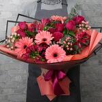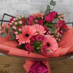 Alstroemeria - 3 pcs Gerbera - 5 pcs rose - 6 pcs packaging - 2 pcs eucalyptus mix - 1 pcs decorative greenery - 5 pcs card - 1 pcs
