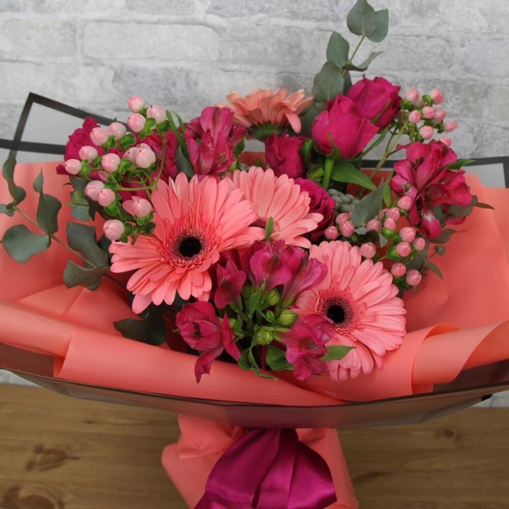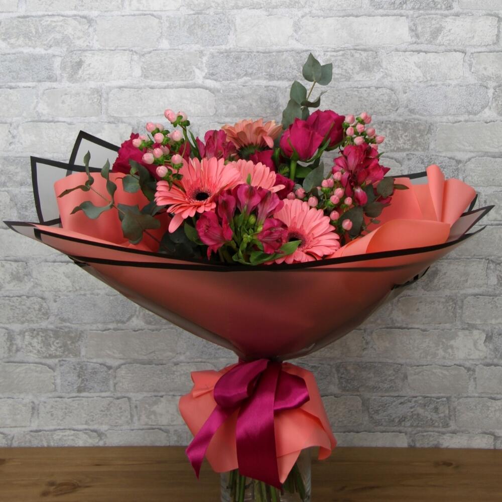 Alstroemeria - 3 pcs Gerbera - 5 pcs rose - 6 pcs packaging - 2 pcs eucalyptus mix - 1 pcs decorative greenery - 5 pcs card - 1 pcs