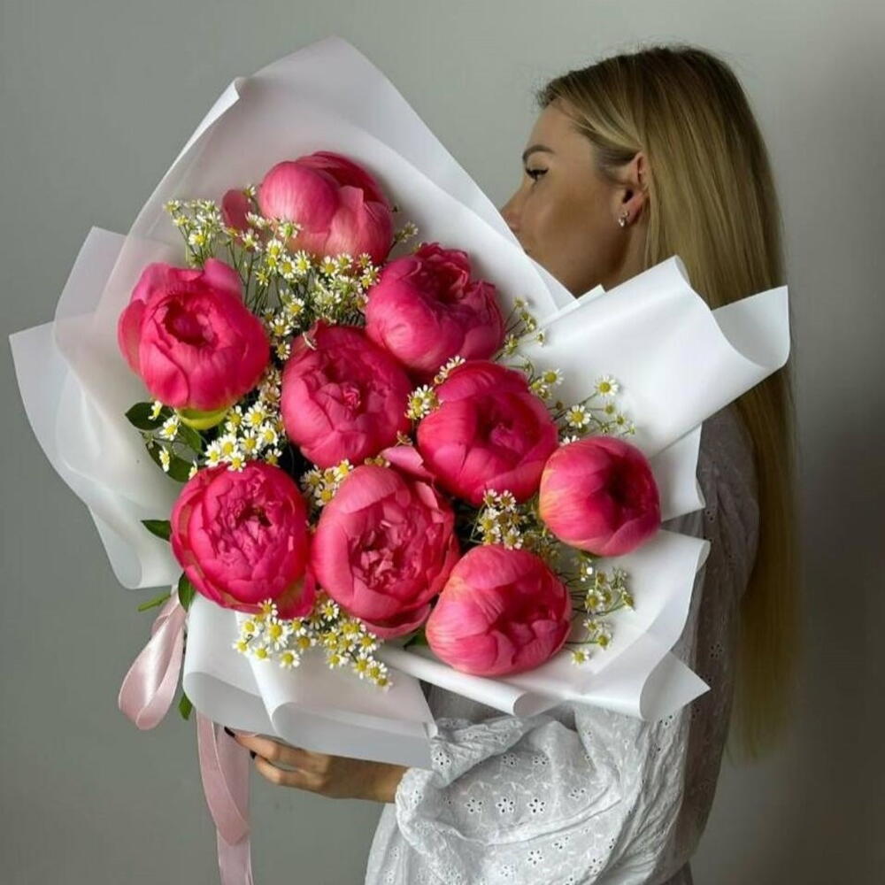 Роскошный букет из нежных ярко-розовых пионов в сочетании с милыми ромашками — воплощение элегантности и весенней свежести.
