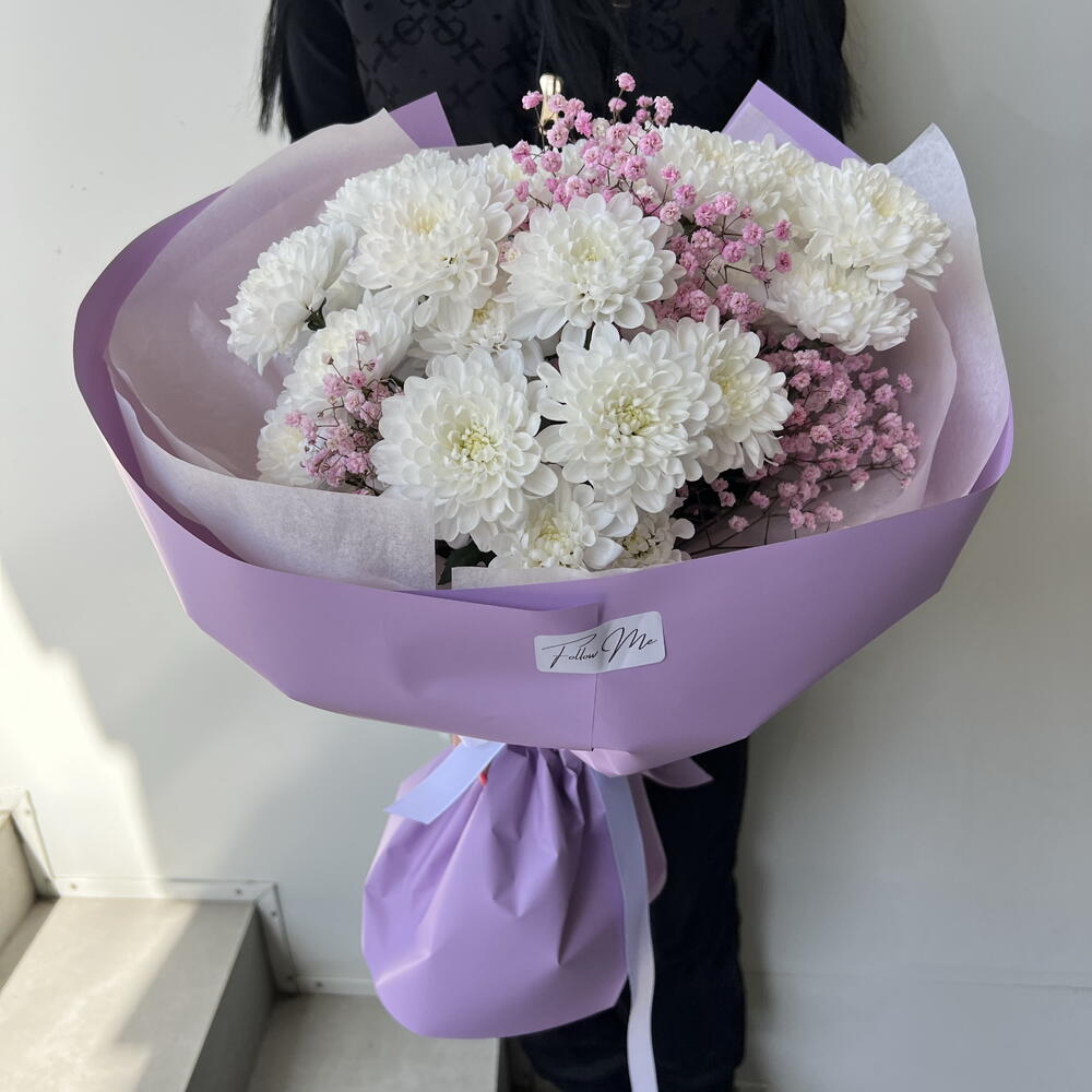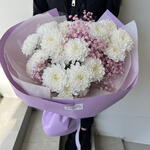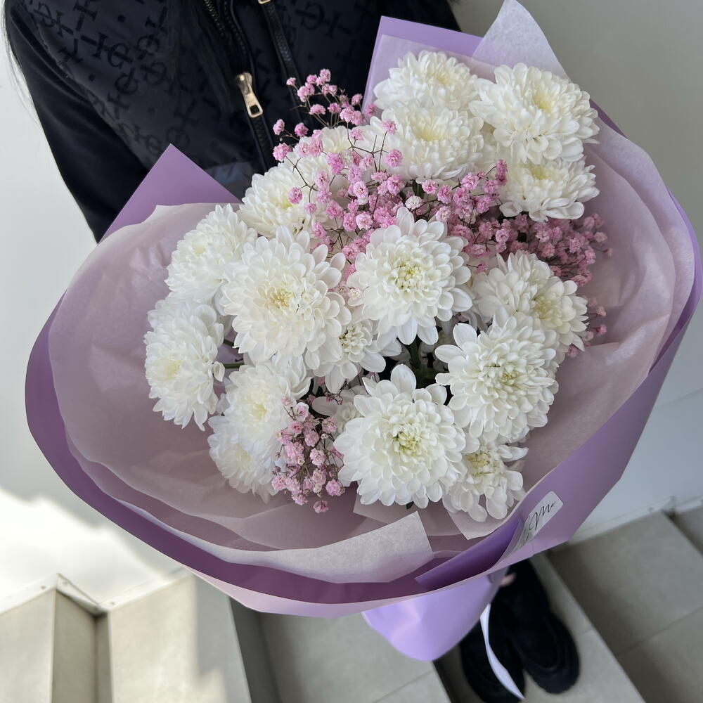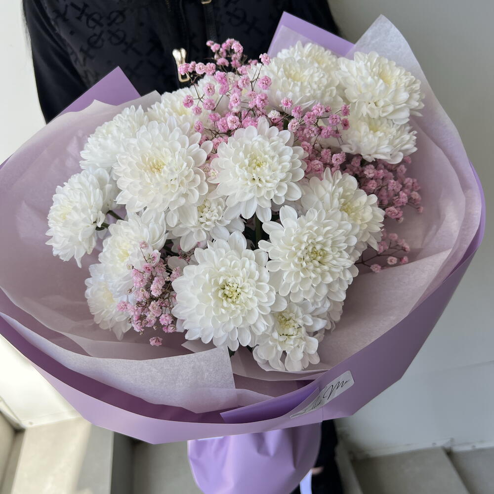 Изысканный букет в лавандовой упаковке, в котором сочетаются белоснежные хризантемы и розовая гипсофила. Эта композиция олицетворяет чистоту, свежесть и утонченную нежность. Идеальный выбор для утреннего поздравления, романтичного жеста или благодарности от души.