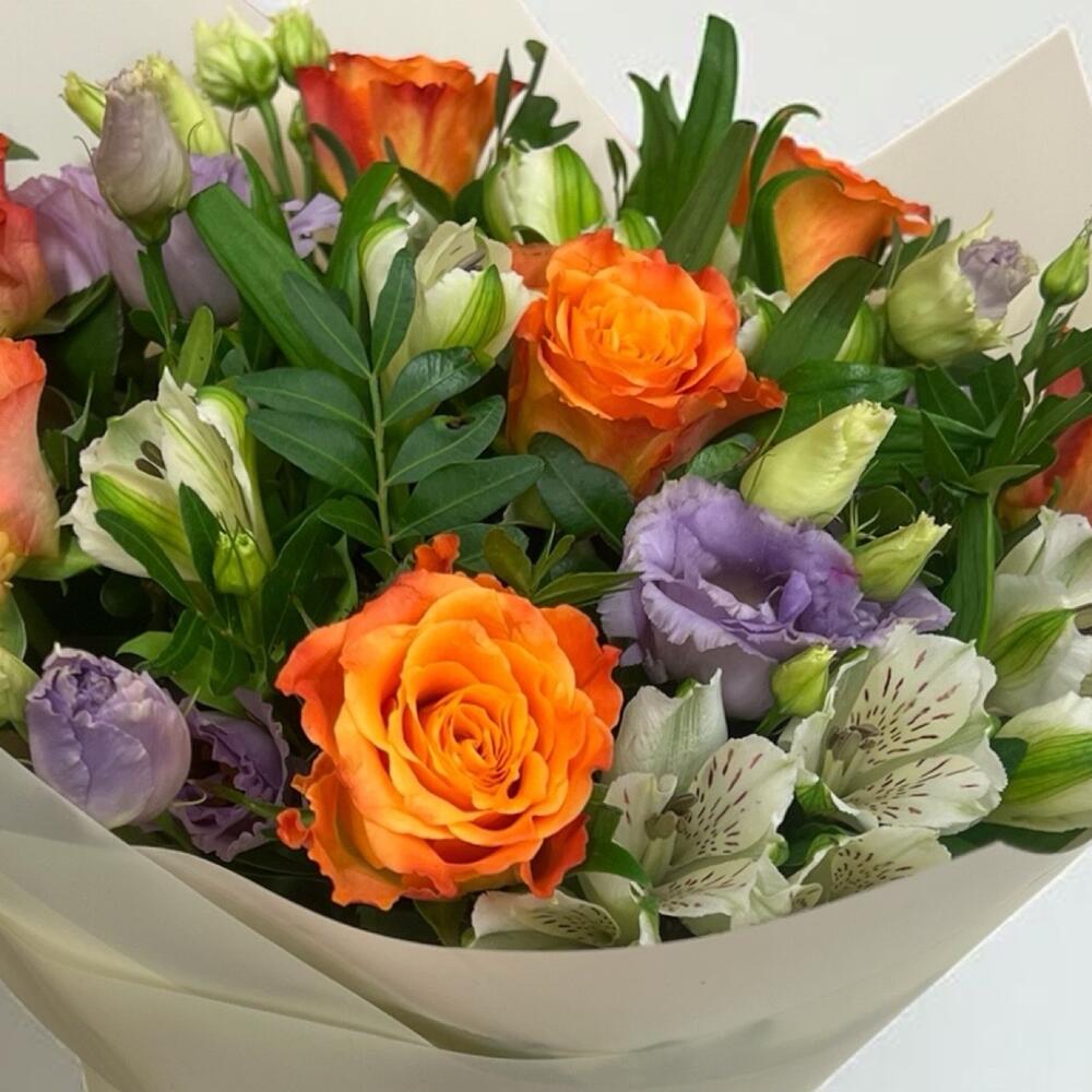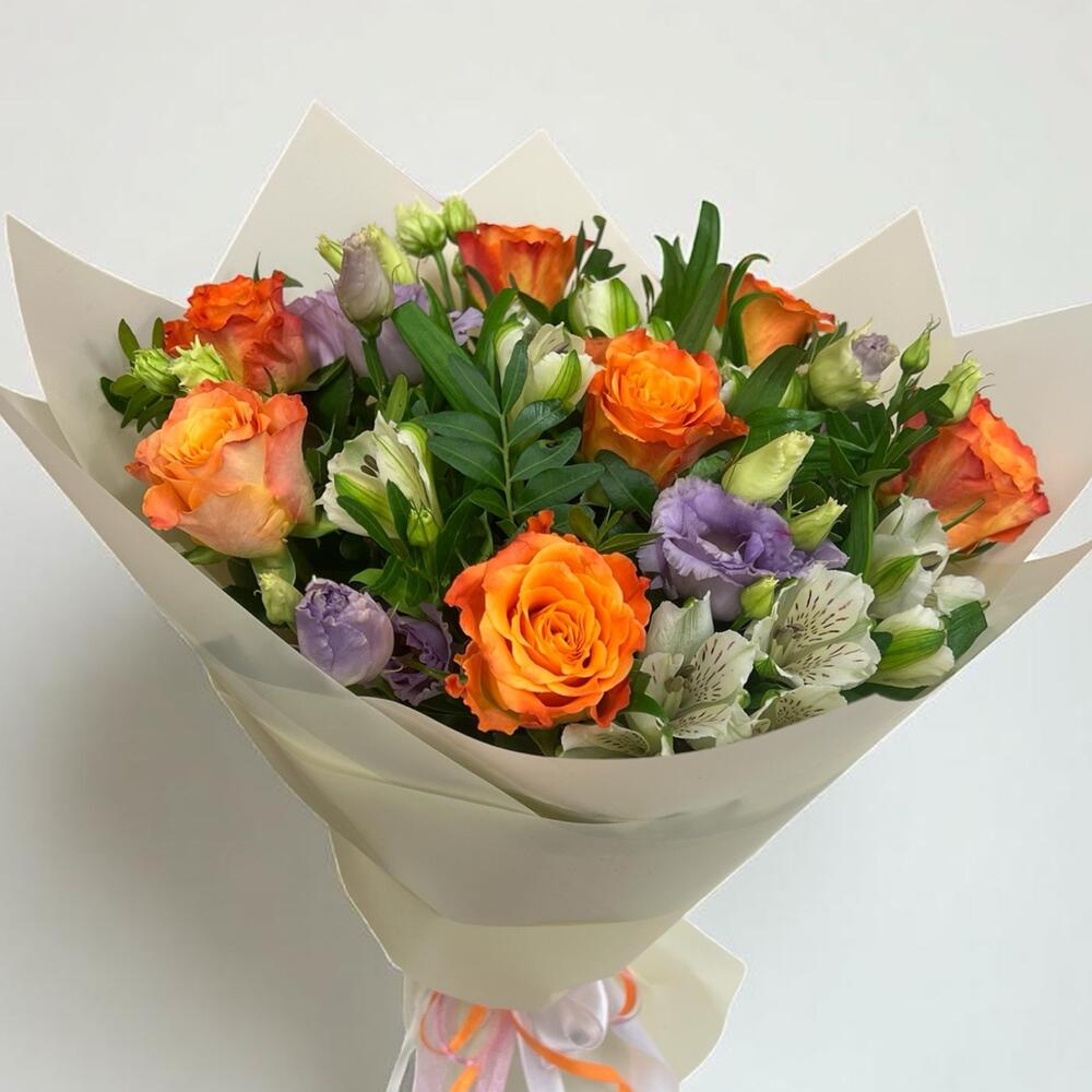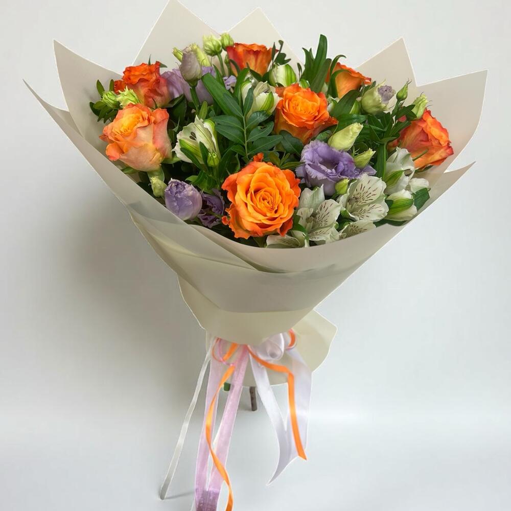 Eustoma - 7 pcs Alstroemeria - 7 pcs Pistachio - 5 pcs orange roses - 7 pcs