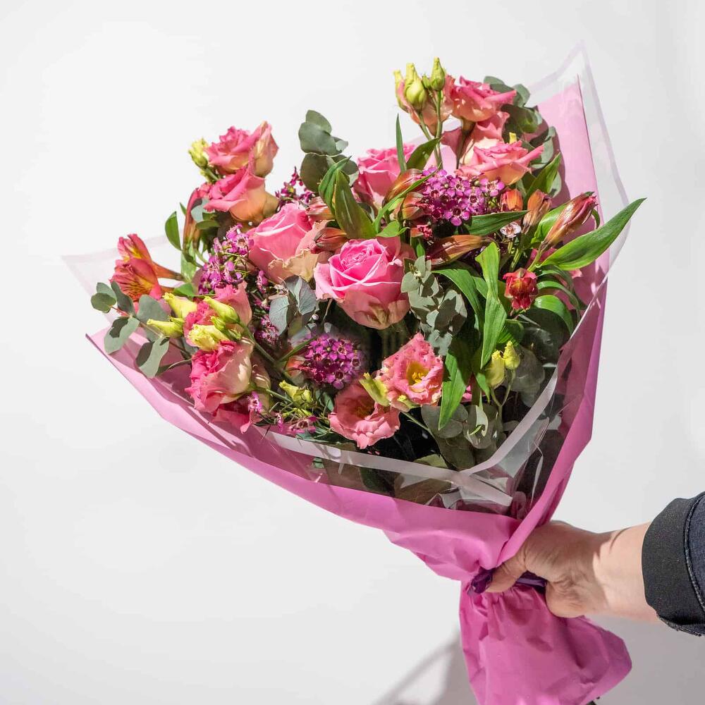 Eustoma - 5 pcs Eucalyptus - 1 pcs Wax flowers - 3 pcs rose - 7 pcs