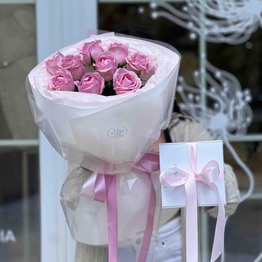 Satin Ribbon - 2 pcs Cellophane - 2 pcs Korean packaging - 2 pcs Tishyu paper - 2 pcs печенье - «меломакарона» 500 гр. - 1 pcs роза "wham" 50 cм. - 9 pcs