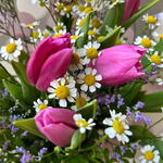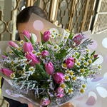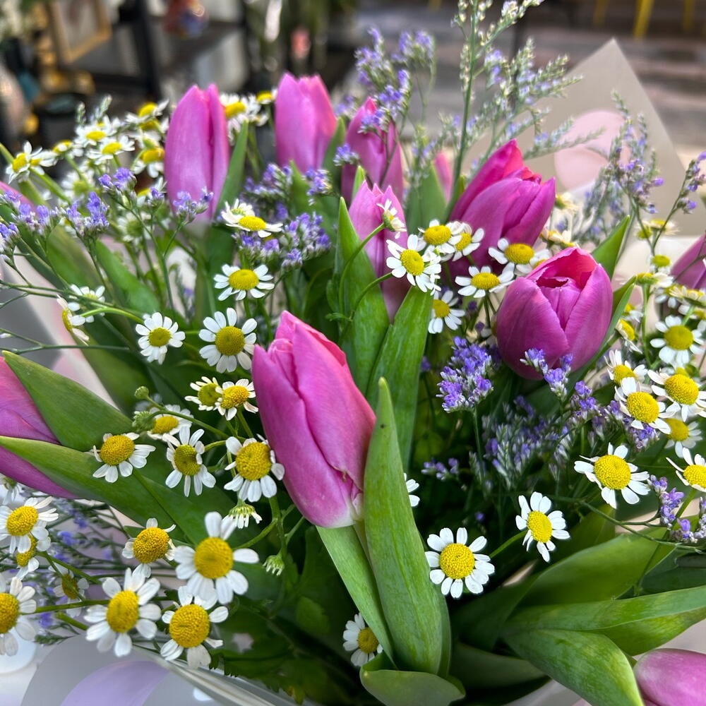 Limonium - 2 pcs Tulip - 11 pcs packaging - 2 pcs bush chamomile - 5 pcs