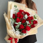 Red rose 50 cm - 17 pcs Ribbon red satin - 1 pcs Eucalyptus Baby Blue - 3 pcs packaging beige matte - 1 pcs