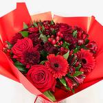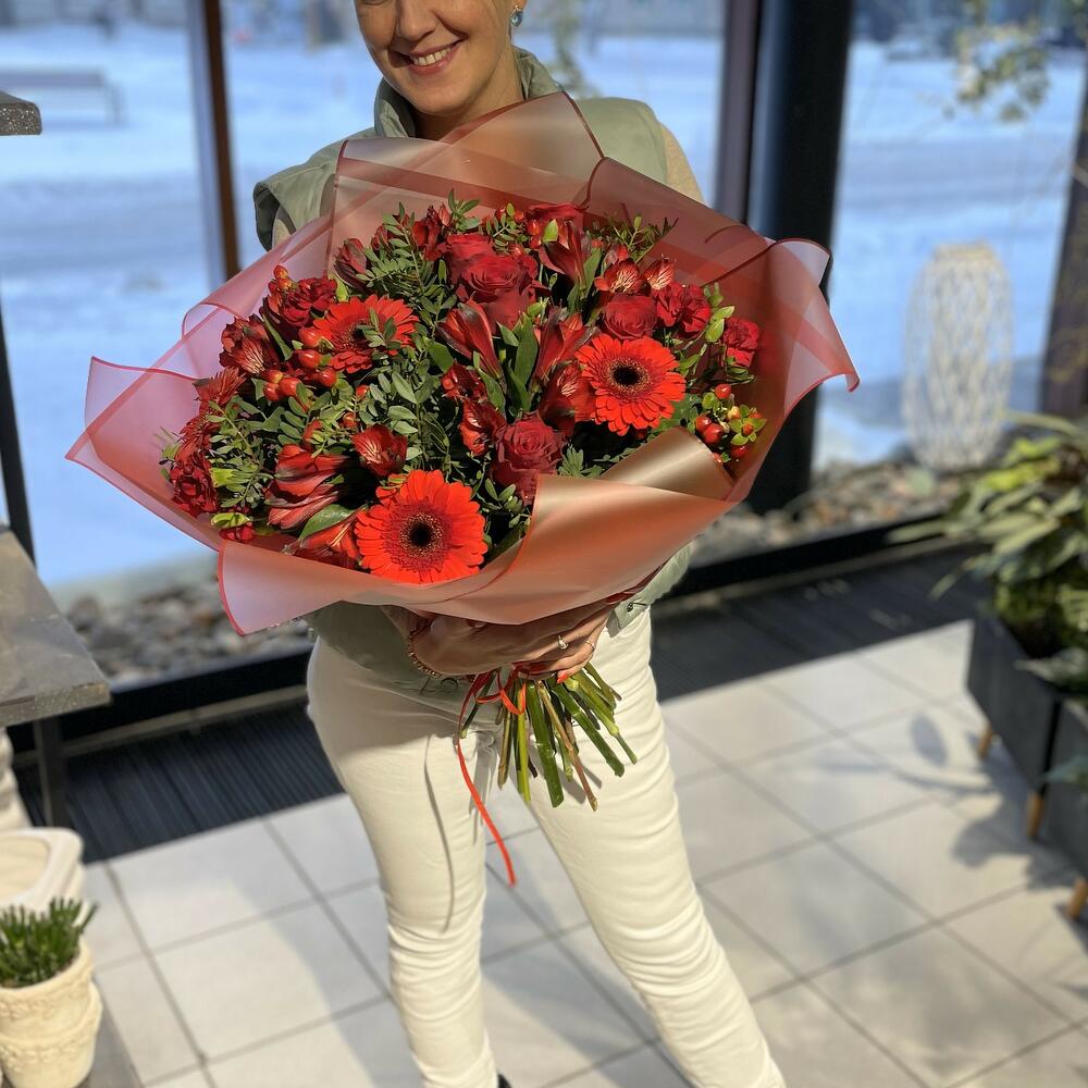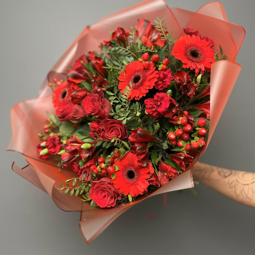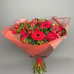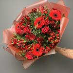 Alstroemeria - 3 pcs Salal - 1 pcs rose - 5 pcs carnation - 5 pcs hypericum - 3 pcs germini - 5 pcs