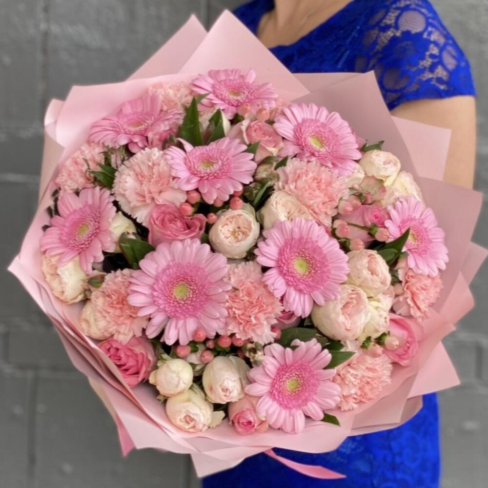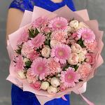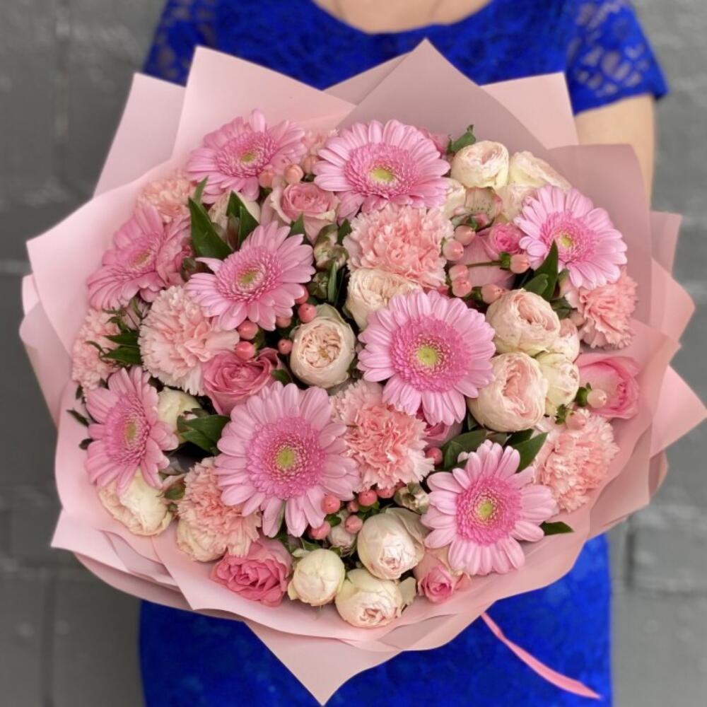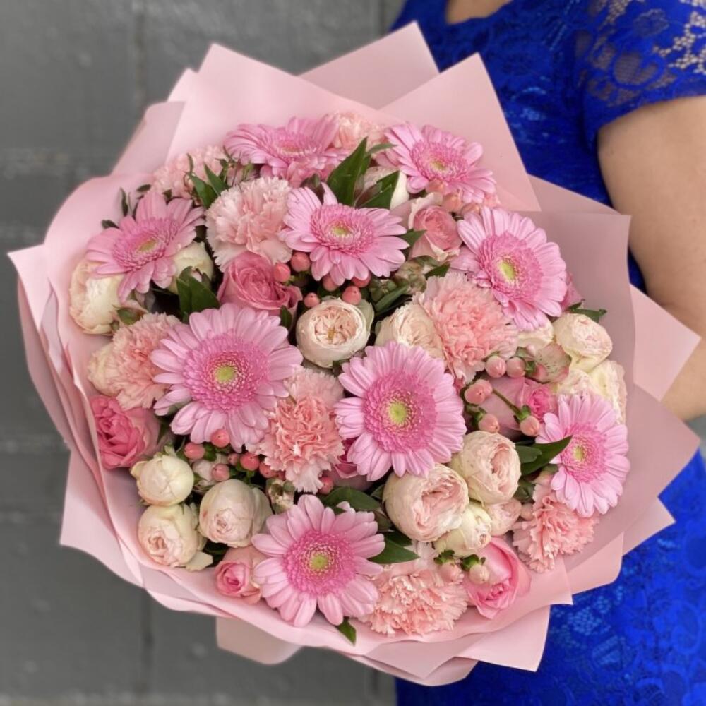 A soft and delicate bouquet in gentle pink tones, featuring pink gerberas, tender dianthus, and spray peony-style roses. Light, airy, and full of charm, this arrangement stays fresh for a long time and brings lasting joy to its recipient. Free message card included. Kindly leave your message in the comments. 🩷