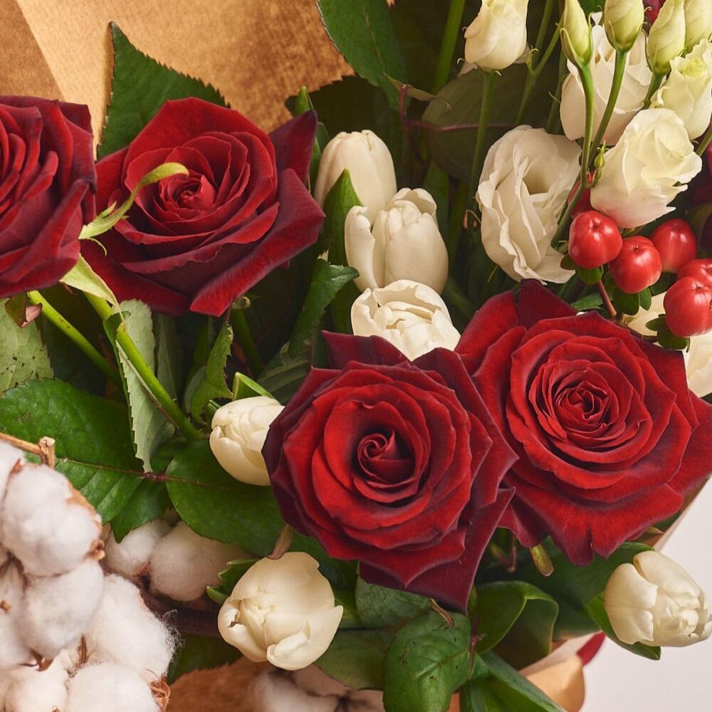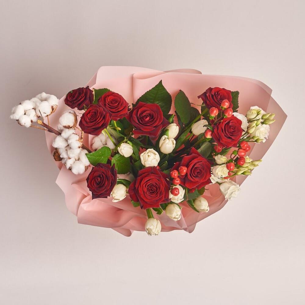 Red rose - 9 pcs Lisianthus - 1 pcs Cotton - 1 pcs packaging - 1 pcs hypericum - 3 pcs white tulip - 9 pcs