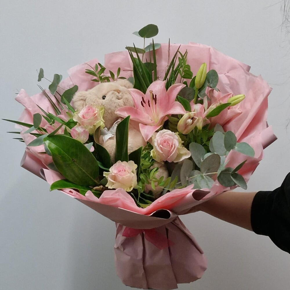 En bokad med Lilja rosor, andra gränd och stor nalle
