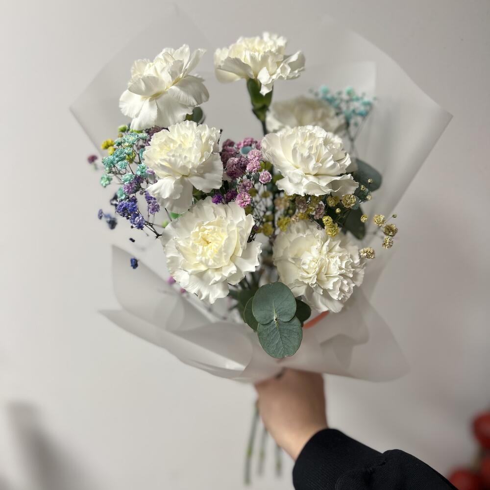 carnation - 7 pcs eucoliptus - 3 pcs colorful gypsophila - 1 pcs