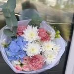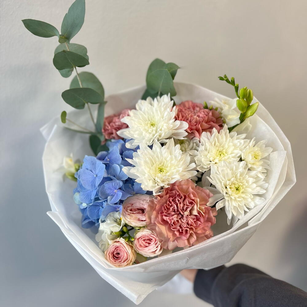 Eucalyptus - 1 pcs hydrangea - 1 pcs diantus - 3 pcs white chrysanthemum - 1 pcs fresia white - 4 pcs spray rose - 1 pcs