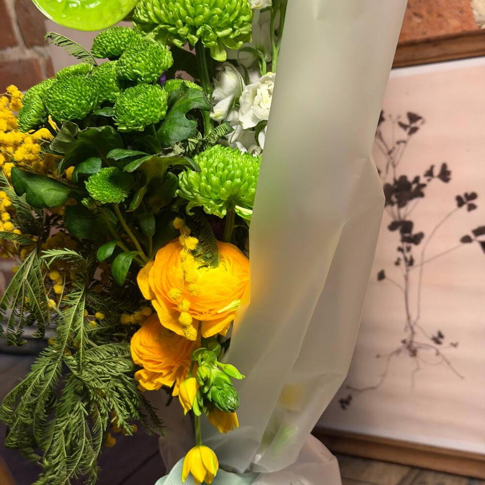 Ornithogalum - 1 pcs ranunculus - 2 pcs anthurium - 1 pcs campanula - 2 pcs delphinium - 2 pcs chrizantema - 1 pcs acacia - 2 pcs big chrysanthemum - 2 pcs