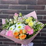A delicate, fresh bouquet in pastel shades of pink, cream and subtle orange. The composition combines romantic roses, energetic apricot-colored mini roses and bright gerberas with a green center, creating a harmonious, airy whole. Wrapped in pastel paper, the arrangement highlights the bouquet's elegant and modern character. It's the perfect choice when you want to give something joyful, warm and full of positive energy.