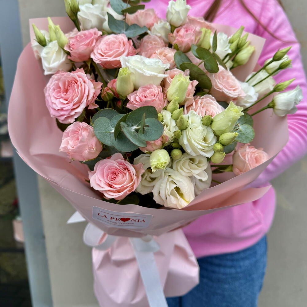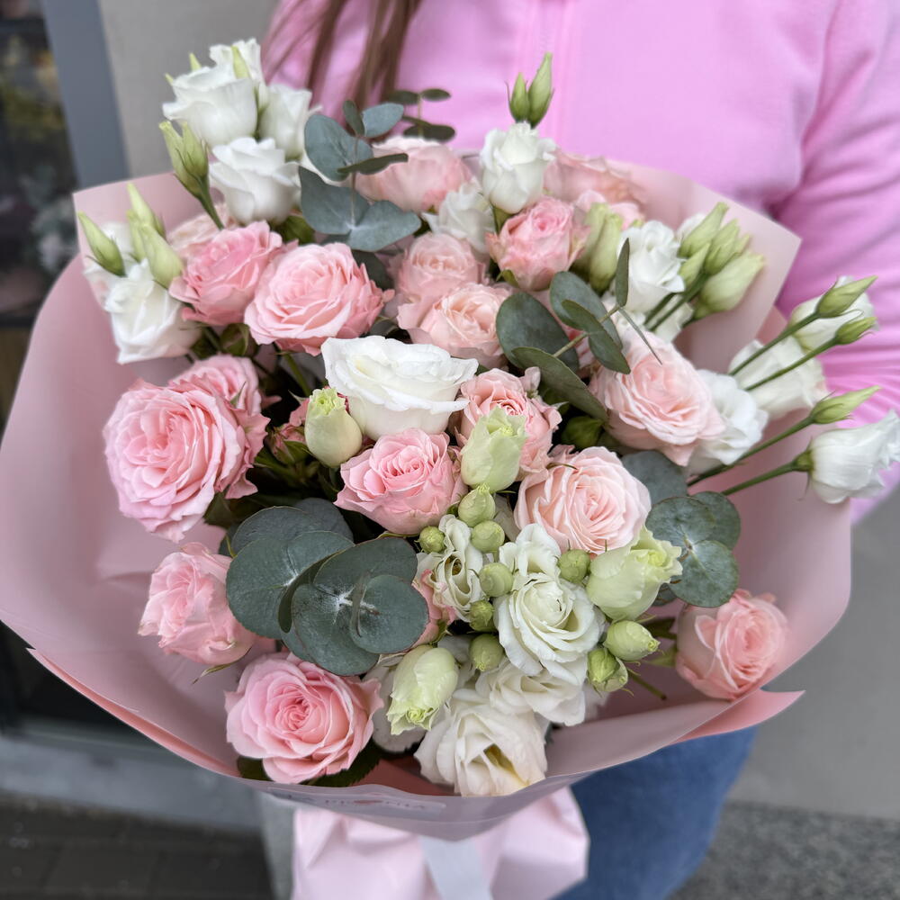 Eucalyptus - 5 pcs Eustoma white - 3 pcs rose galazhkova - 5 pcs paper foil - 1 pcs