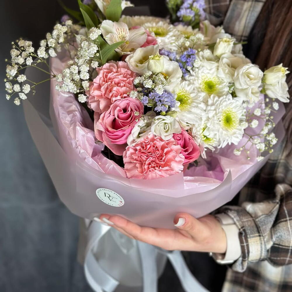 alstroemeria mix - 2 pcs eustoma mix - 2 pcs chrysanthemum - 2 pcs goźdiki - 3 pcs colorful rose - 3 pcs decorative accessories - 2 pcs