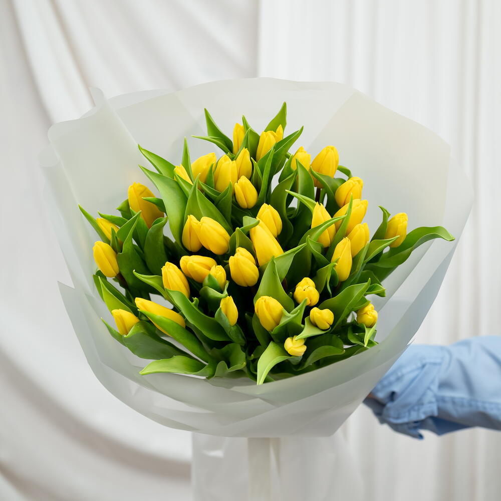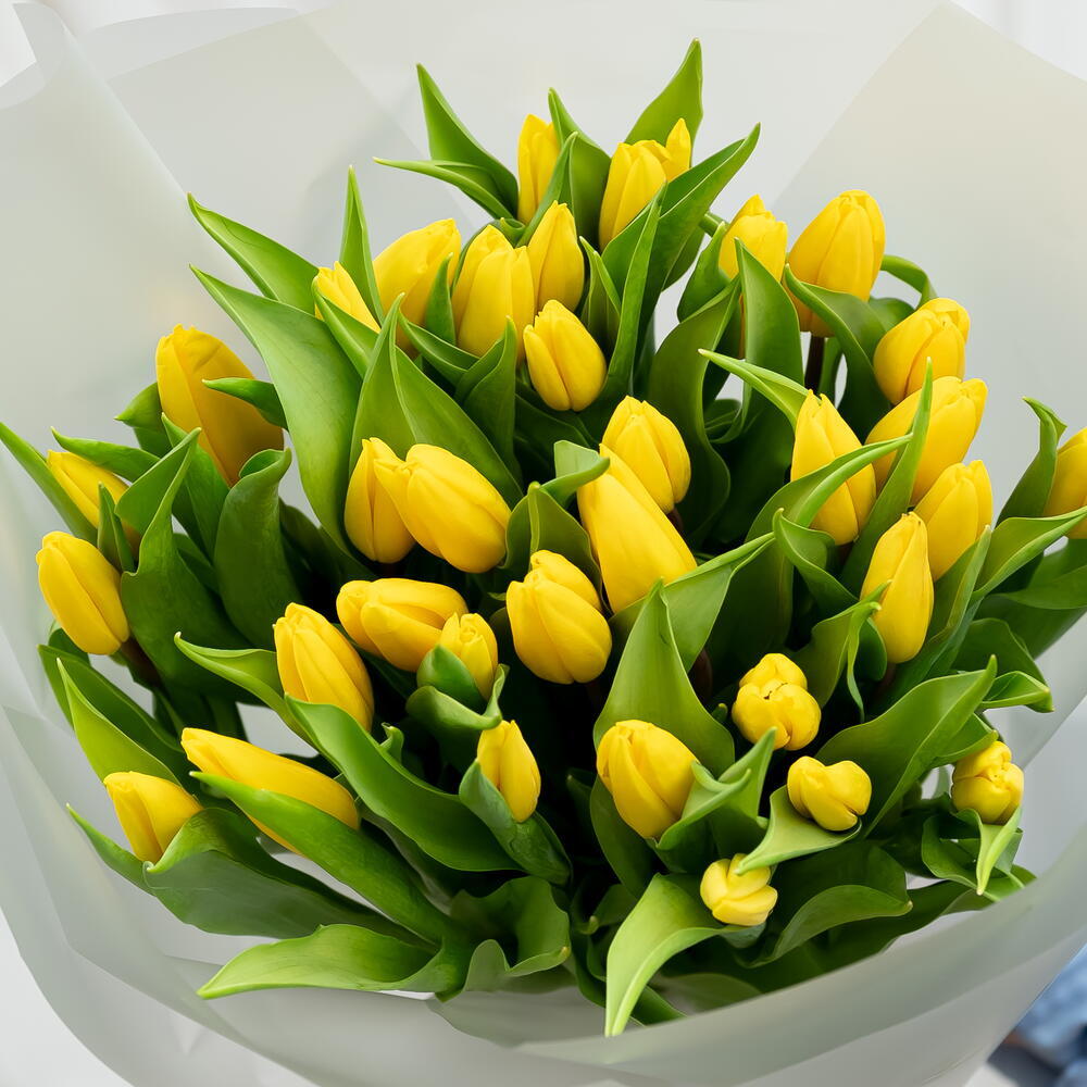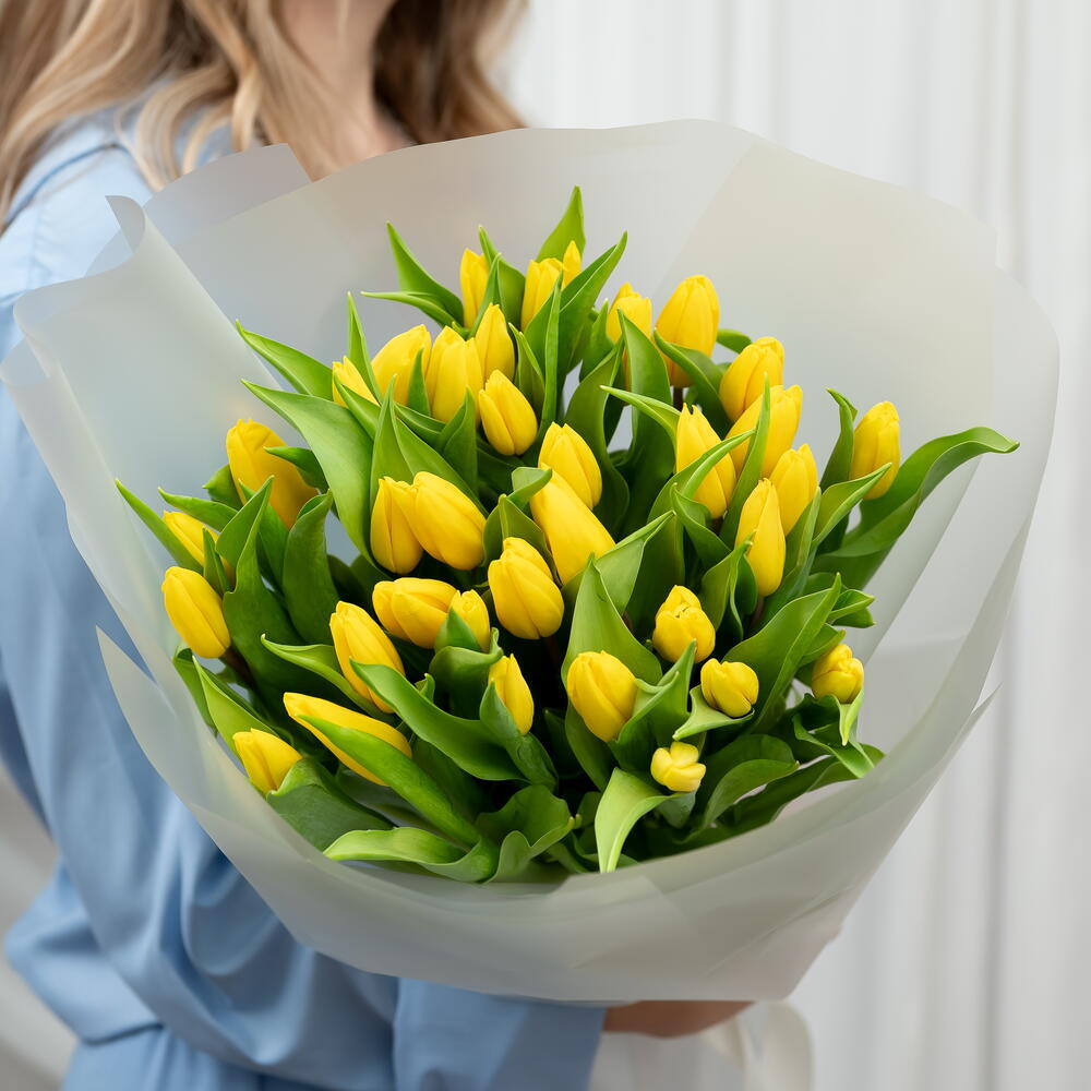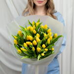 An impressive bouquet of 35 intensely yellow tulips, arranged in a lush and elegant composition. Wrapped in delicate, semi-transparent paper, it creates a bright and joyful arrangement symbolizing warmth, friendship, and happiness. It is a generous gift brimming with positive energy, ideal for celebrations, congratulations, or simply to bring a little sunshine to someone's day.