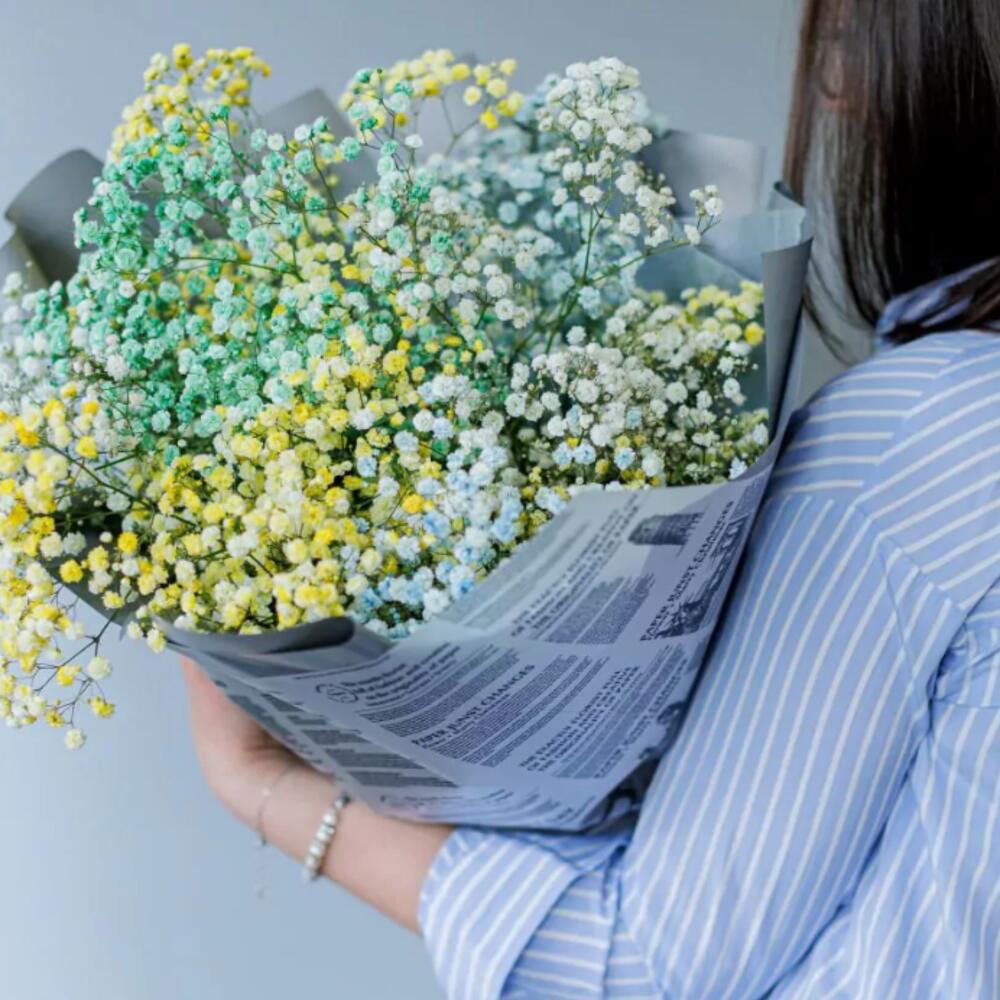 The price is for a small bouquet of 9-11 flowers, but we make bouquets of various sizes from 9 to 50 flowers. Option to add a personalized note with a dedication for the recipient. Composition: colorful gypsophila.