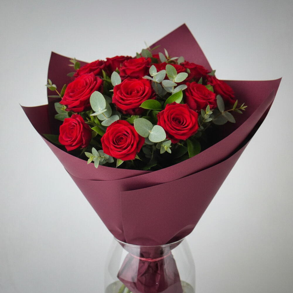 red rose - 25 pcs eucalyptus - 5 pcs decorative paper - 1 pcs