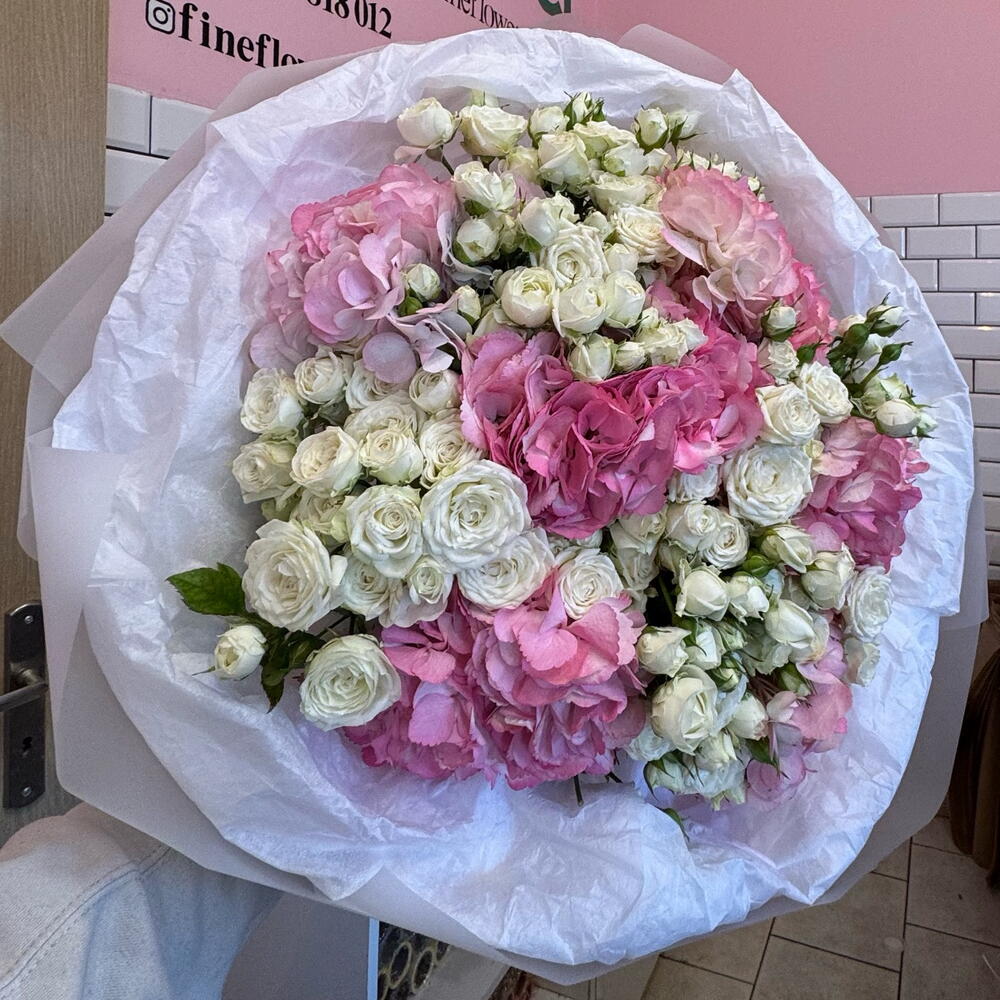 A delicate yet striking bouquet of hydrangeas and spray roses is a composition full of elegance, romance and natural charm. The fluffy, impressive flower heads of the hydrangeas give the bouquet softness and volume, creating the effect of a subtle cloud of flowers. Their noble character is perfectly complemented by small, graceful spray roses, which bring lightness, freshness and delicate details to the arrangement. This combination symbolizes the harmony of feelings, gratitude and the warmth of relationships, which is why the bouquet is ideal as a gift for special occasions – from birthdays and anniversaries to an elegant gesture for no particular reason. The composition delights with its subtle color palette, natural form and timeless elegance – ideal for people who appreciate beauty contained in delicate, meticulously refined details.