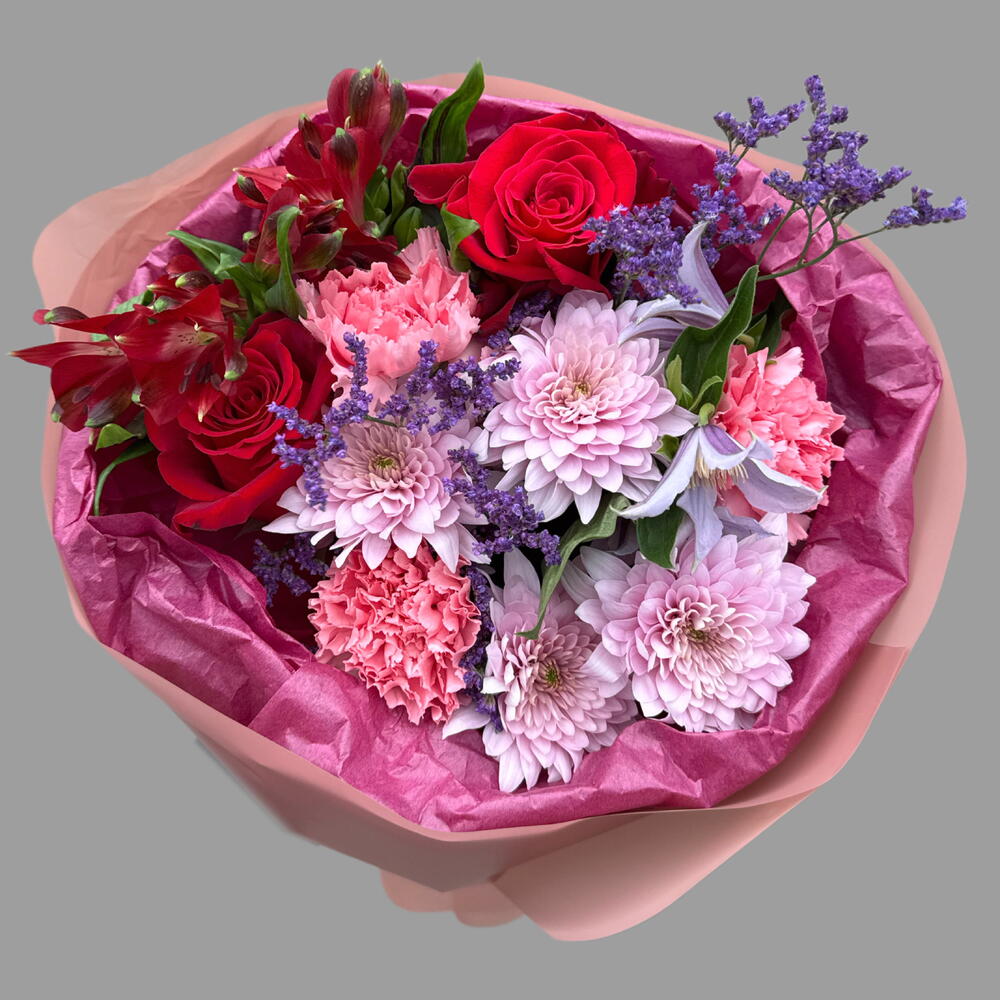 Limonium - 1 pcs Clematis - 1 pcs rose - 2 pcs astromeria - 1 pcs carnation - 3 pcs daisy - 1 pcs decorative paper - 1 pcs