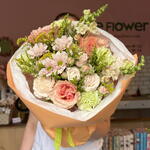 This signature bouquet perfectly combines 3 luxurious roses, 1 delicate rose sprig, 1 charming daisy and 2 fragrant snapdragons. The composition is completed by 5 sprigs of delicate Solidago and 7 light carnations, and 1 sheet of decorative paper completes the aesthetic. This bouquet will surely bring a touch of elegance and romance to your interior or become an unforgettable gift for a special person.