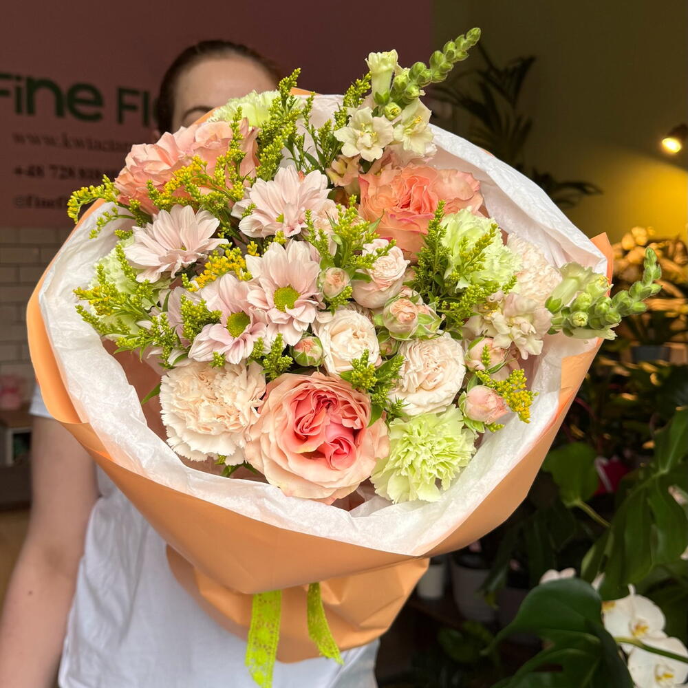 This signature bouquet perfectly combines 3 luxurious roses, 1 delicate rose sprig, 1 charming daisy and 2 fragrant snapdragons. The composition is completed by 5 sprigs of delicate Solidago and 7 light carnations, and 1 sheet of decorative paper completes the aesthetic. This bouquet will surely bring a touch of elegance and romance to your interior or become an unforgettable gift for a special person.