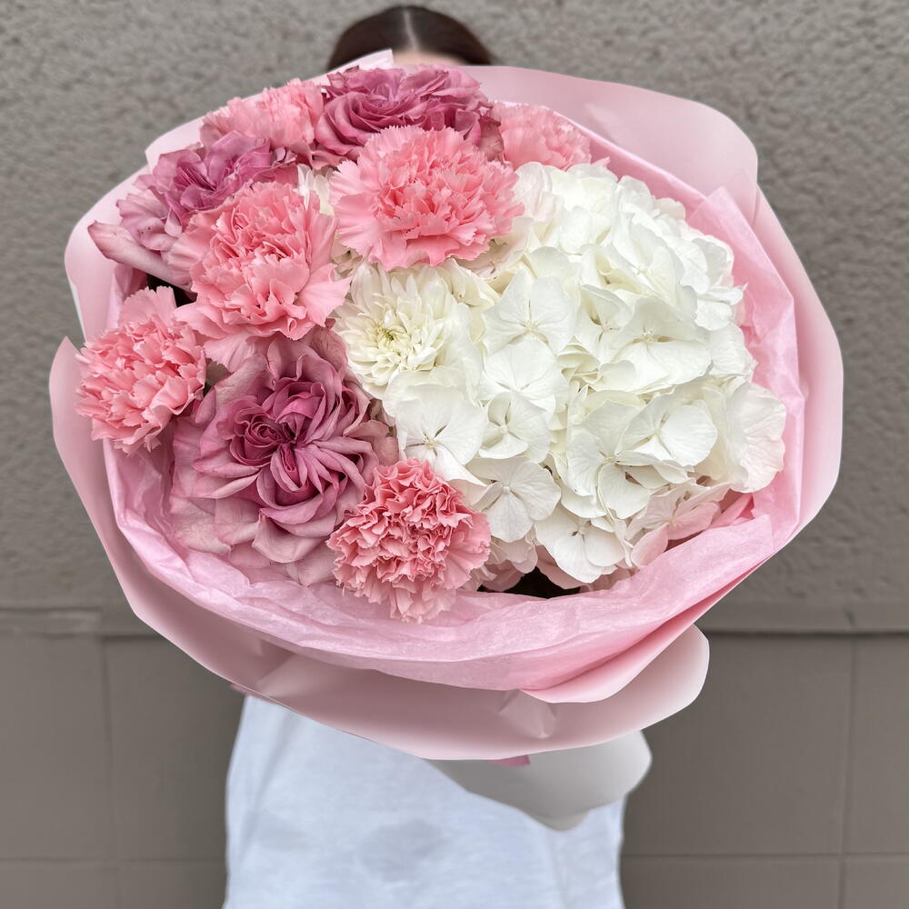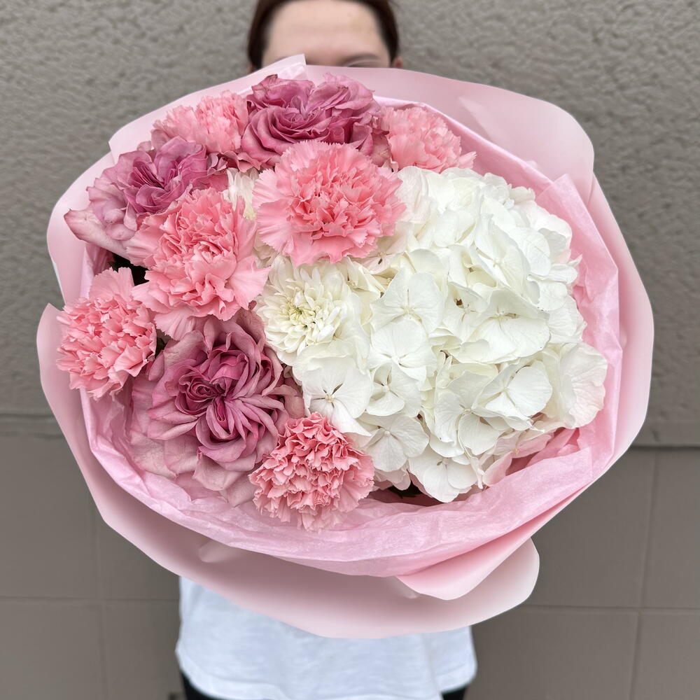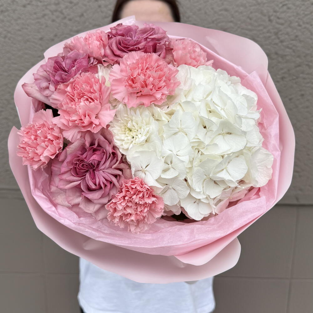 hydrangea - 1 pcs carnations - 6 pcs roses - 3 pcs daisy - 1 pcs decorative paper - 1 pcs