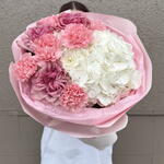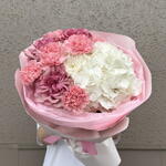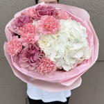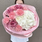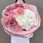 Beautiful bouquet of flowers consists of 1 hydrangea, 6 carnations, 3 roses and 1 daisy. The whole is perfectly wrapped in 1 piece of decorative paper. It is the perfect choice for people who love elegance and delicacy. Our special offer from the florist will surely catch your eye!