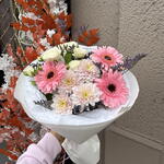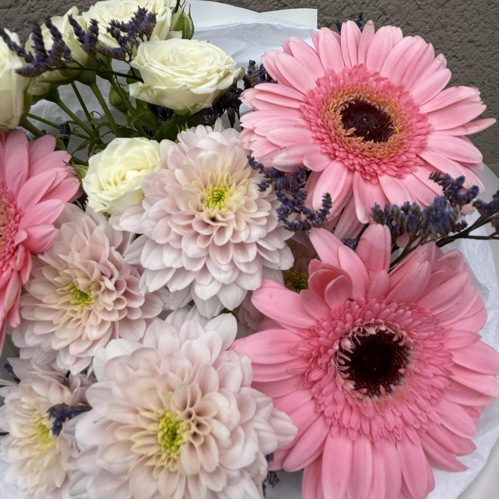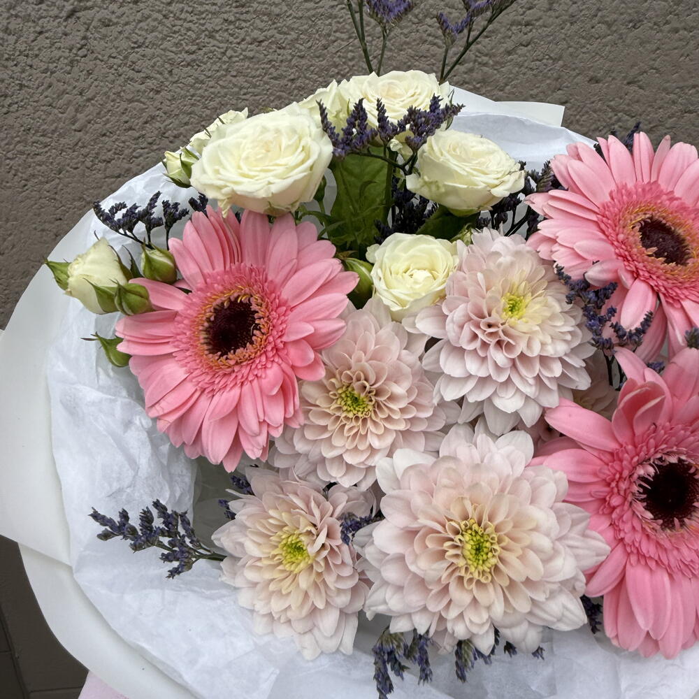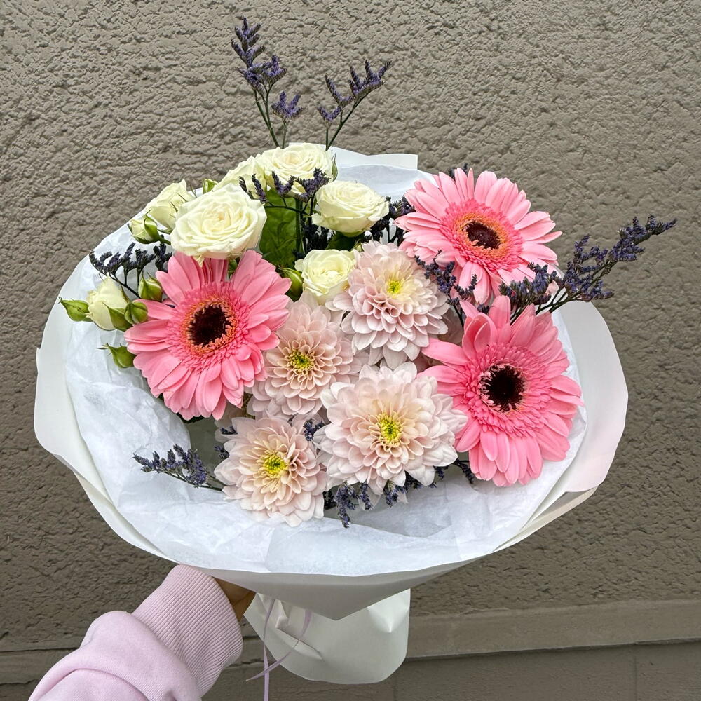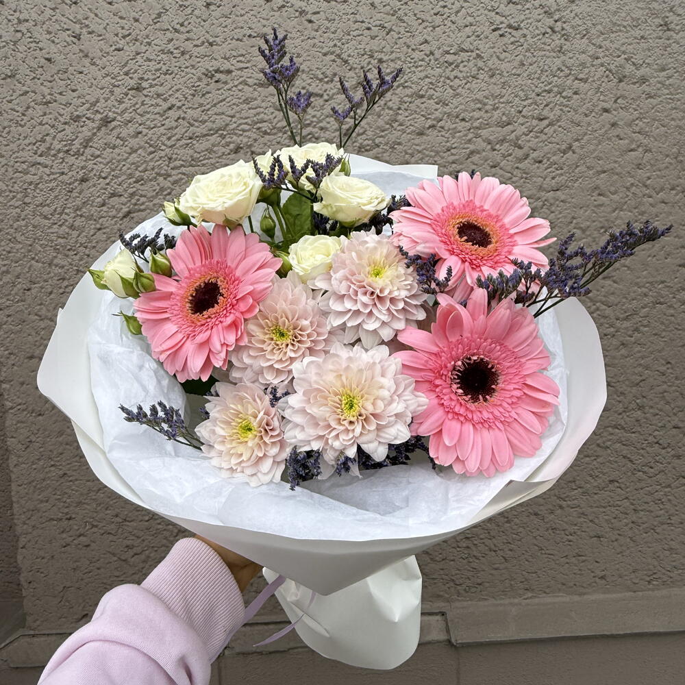 Limonium - 1 pcs Gerbera - 3 pcs spray rose - 1 pcs daisy - 1 pcs decorative paper - 1 pcs