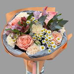 Clematis - 1 pcs anthurium - 1 pcs rose - 3 pcs chamomile - 2 pcs eucalyptus - 1 pcs astromeria - 3 pcs carnation - 7 pcs