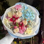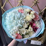 dianthus - 6 pcs gypsophila - 1 pcs tulip - 2 pcs hydrangea - 1 pcs astromeria - 1 pcs spray rose - 1 pcs
