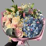 dianthus - 5 pcs lagurus - 5 pcs rose - 3 pcs hydrangea - 1 pcs chamomile - 3 pcs eucalyptus - 3 pcs astromeria - 2 pcs spray rose - 2 pcs